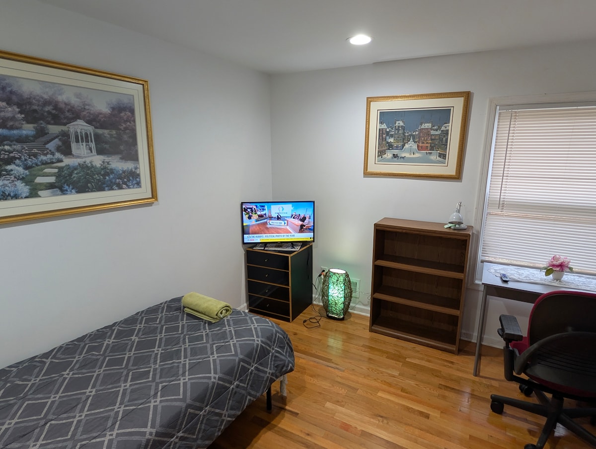 Relax in your private guest suite on the first level of our home, featuring a separate entrance and a private bathroom for your convenience and privacy. The suite includes a cozy bedroom and a comfortable living area, thoughtfully stocked with all the essentials you need for a pleasant stay —minus a kitchen. *5 minutes away grab anything you want to eat, even late into the night, with many spots open until 2-3 AM downtown New Brunswick.