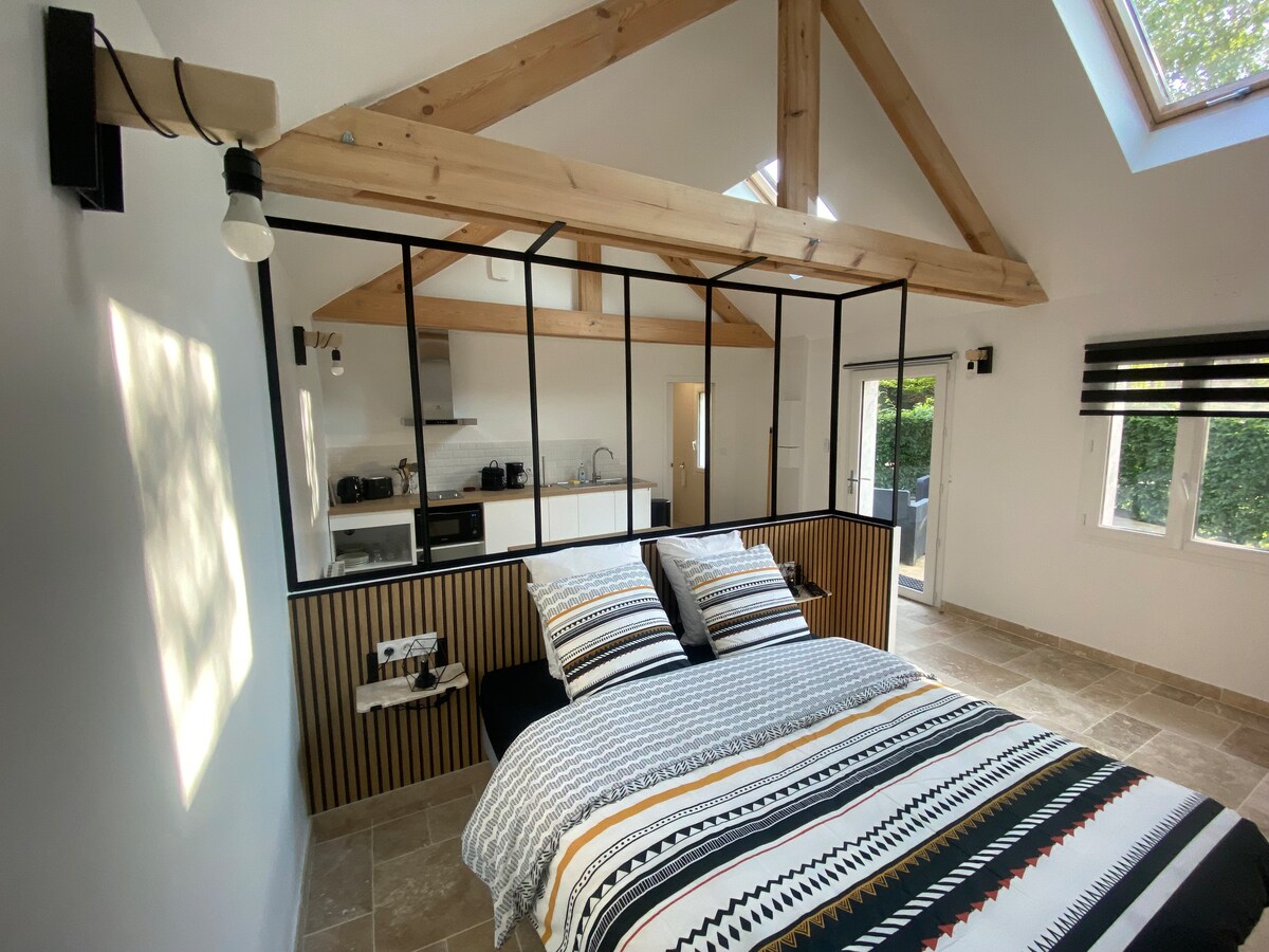 We will welcome you with ease, next to our home, in a modern studio, set back from the street, for a quiet stay. There is an equipped kitchen, a comfortable 160 x 200 bed, a walk-in shower, and separate toilet. You can stroll in the garden of about 300 m2, which I converted into a mini-garden Edible Forest. And for even more fun, I can offer you a breakfast basket to enjoy the moment even more!