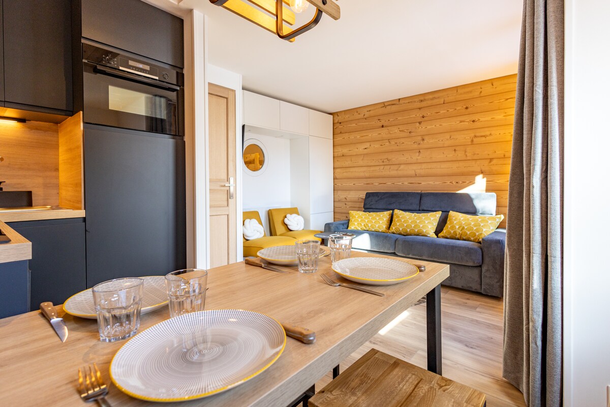 Apartment rated 3*** and "Méribel Label". Great location and very nice exposure 50 m from the slopes (Plateau Rond-Point). Close to shops, this fully renovated 2-room apartment includes an equipped kitchen (dishwasher, microwave grill, Nespresso, induction stove...), dining area, sofa bed in the living room. It has one bedroom with double bed and shower room (washing machine). The refined decor will seduce you. Large balcony accessible from living room and bedroom. Parking.
