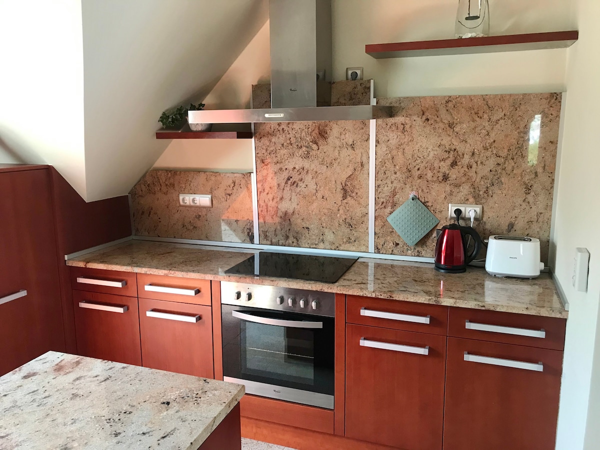 Our new penthouse suite offers a truly exclusive environment for those staying here. The suite of more than 80 square meters awaits our guests with its spacious living room, two bedrooms, fabulous kitchen and bathroom with a bathtub for two. From the living room there is a huge private terrace with a unique panorama, sun loungers, barbecue, garden furniture. Ideal for small groups of friends, larger families.