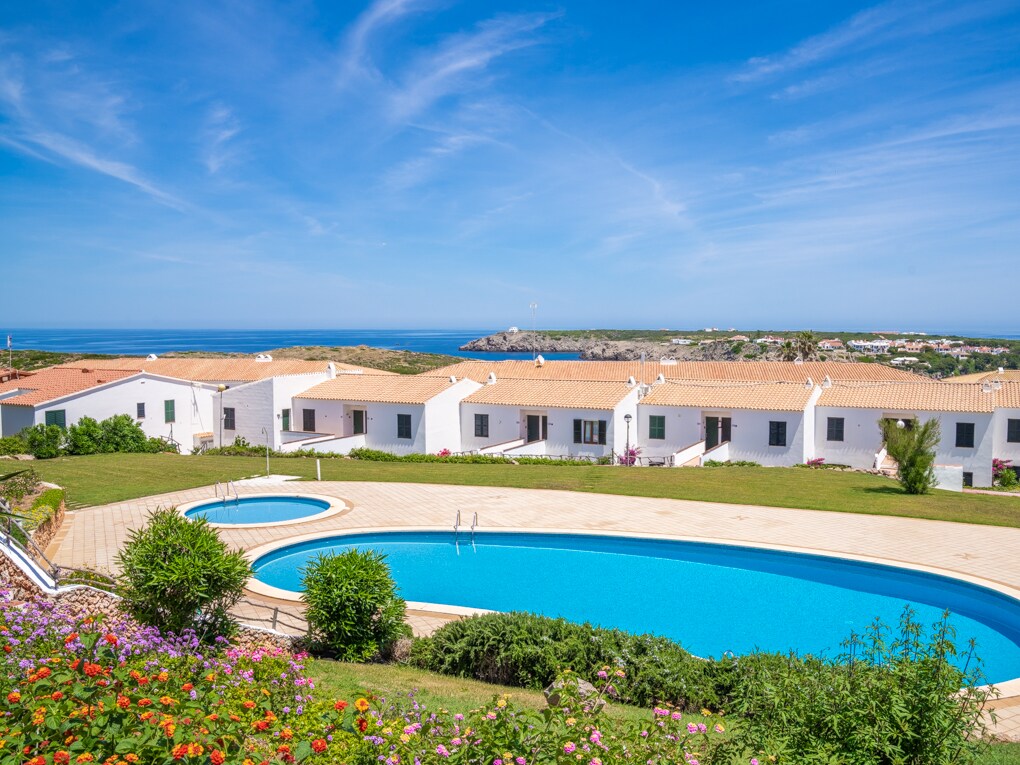 Cozy 40 m² apartment with 2 private terraces and ocean views, ideal for relaxing in Menorca. 1 bedroom, 1 bathroom, living room with integrated kitchen and 2 double beds (for 4 people). Perfect for couples or small families. Located in a quiet family complex with green areas, close to supermarkets, bus stop and GR. Just 200 m from Arenal d'en Castell Bay, enjoy sun, sea and outdoor activities. Unforgettable vacations with all the amenities!