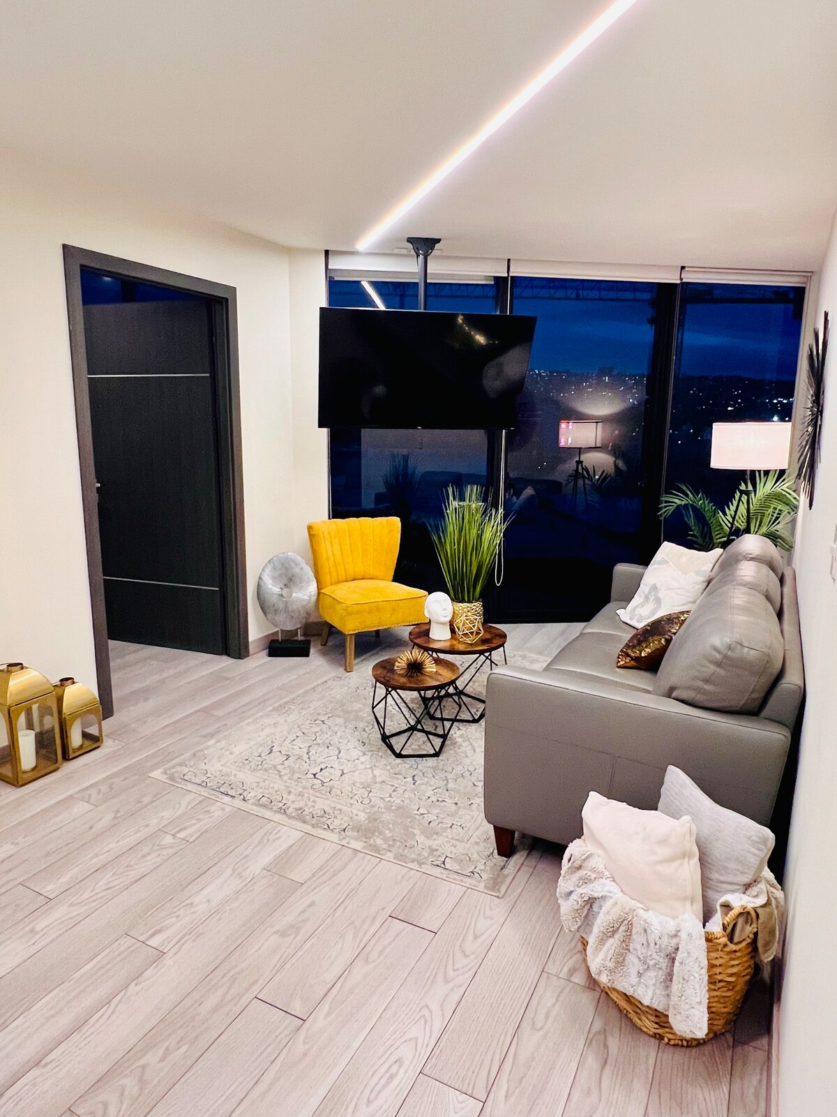 Enjoy a stylish experience in this accommodation located 10 minutes from the international crossing by car, 10 minutes from the tourist area on foot. Overlooking downtown Tijuana. Close to cafes and restaurants in the area. Comfortable and safe to walk, with 24-hour internal security. The apartment has two balconies and excellent lighting, floor-to-ceiling windows with blackout blinds for more lighting control.