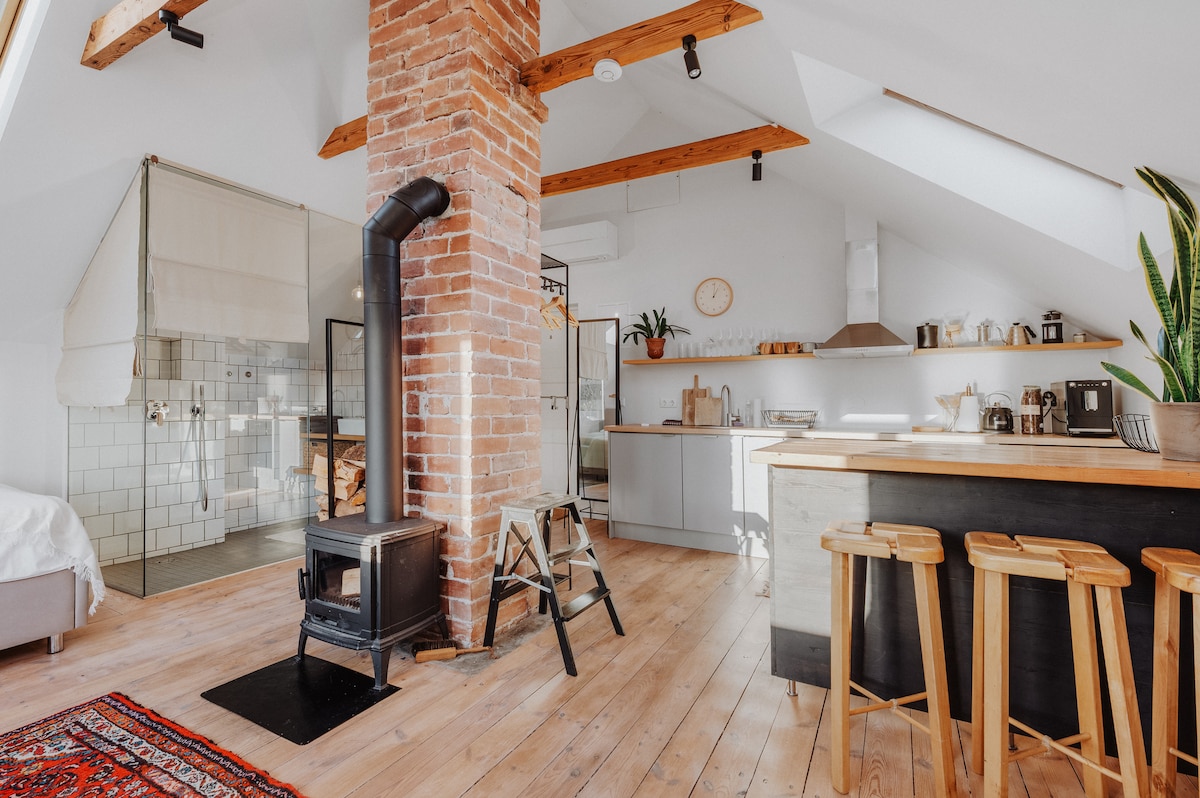Cozy loft in Haapsalu's old town, 100m from the sea promenade and iconic Kuursaal. Exposed brick, hardwood floors, fireplace and glass-wall shower. Sleeps up to 4 — king bed, sofa bed and crib. Fully equipped kitchen, AC, free parking and a private backyard. Castle, cafes and shops all within walking distance. Perfect for couples or families.