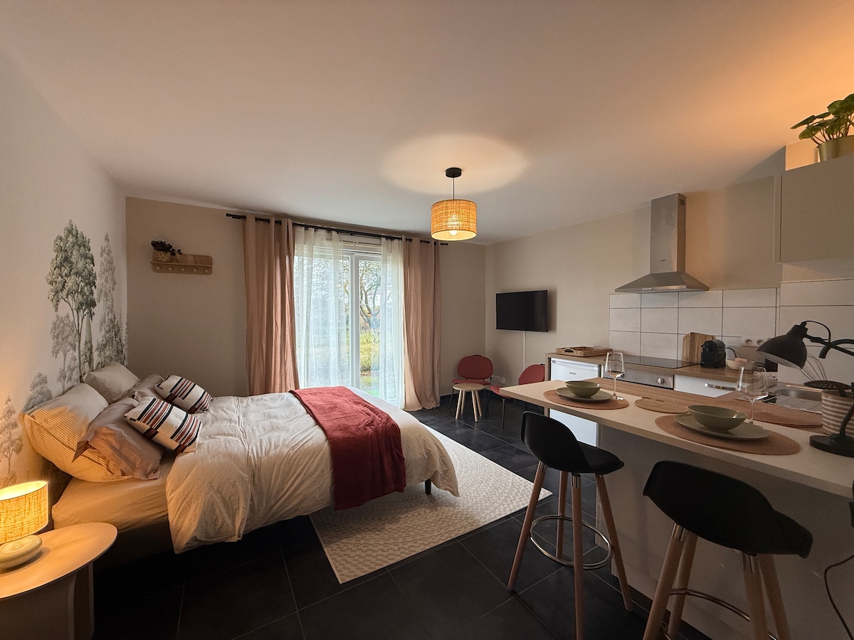 T2 cosy 35m2, rue stationnement gratuit. • 1 Pièce de vie avec comptoir dînatoire, cuisine équipée (lave-vaisselle,four, micro-ondes, plaques vitro, frigo/congel, Dolce Gusto, petite epicerie, café, thé…), canapé, télé et wifi. • 1 Chambre: Lit queen size 160x200 avec une douche attenante (Bac 82x78) • 1 WC séparé Cheminée électrique Linge de lit, serviettes, gel douche fournis. Nous partageons avec vous notre jardin avec boulodrome et petit chalet équipé d'une cuisine d’été. Lingerie
