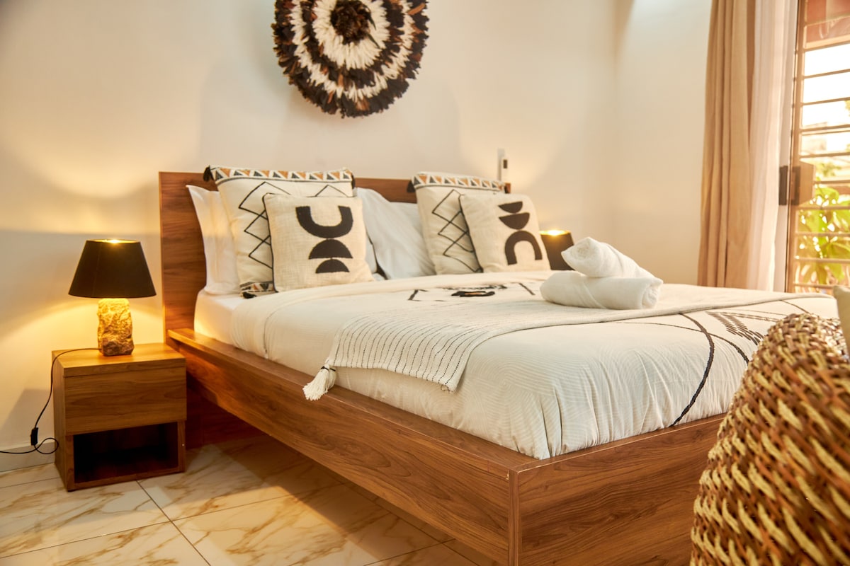 Bienvenue à Résidence HAYMES, Un appartement alliant élégance contemporaine, accents africains et haut de gamme. Niché au cœur du quartier calme de Mockeyville, ce cocon d’une chambre vous offre l’intimité d’un chez-soi, et le raffinement d’un lieu pensé pour se ressourcer. Style & Ambiance Décoration afro-minimaliste, lignes épurées, matières naturelles, objets d’art et mobilier recherchés pour profiter des chaleureuses journées, et des douces soirées bassamoises...