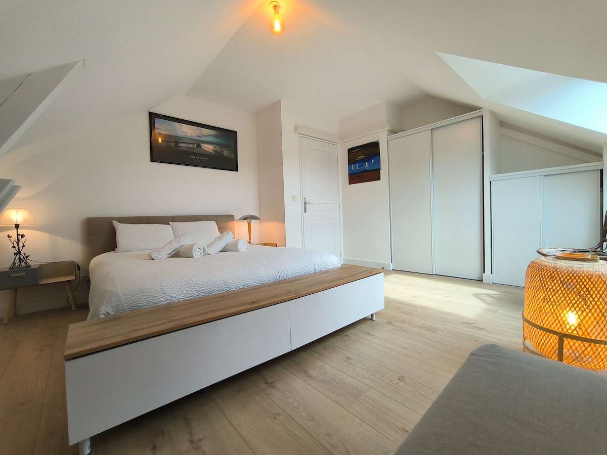 Kick back and relax in this calm, stylish space. Nestled on the 7th and top floor of the Trespoey Residence, the Canopée suite, designed as a hotel suite with fully equipped kitchen, will seduce you. It was designed with noble and ecological materials (wood, granite, A+ paint, etc.) while being functional with a minimalist and contemporary design. The location is in Pau's most popular residential area with easy, free parking.