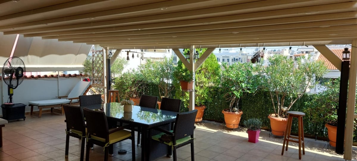 A truly unique royal-style penthouse just 8 min from Athens Airport. Like a private museum, it features antiques, oversized 200×220 beds, a large private terrace, and access to the rooftop for panoramic views and plane spotting. Ideal for families, with plenty of space and character you won’t find anywhere else in the area. Glass doors flood the space with natural light and frame the open sky — a one-of-a-kind stay that blends classic charm with rare city views.