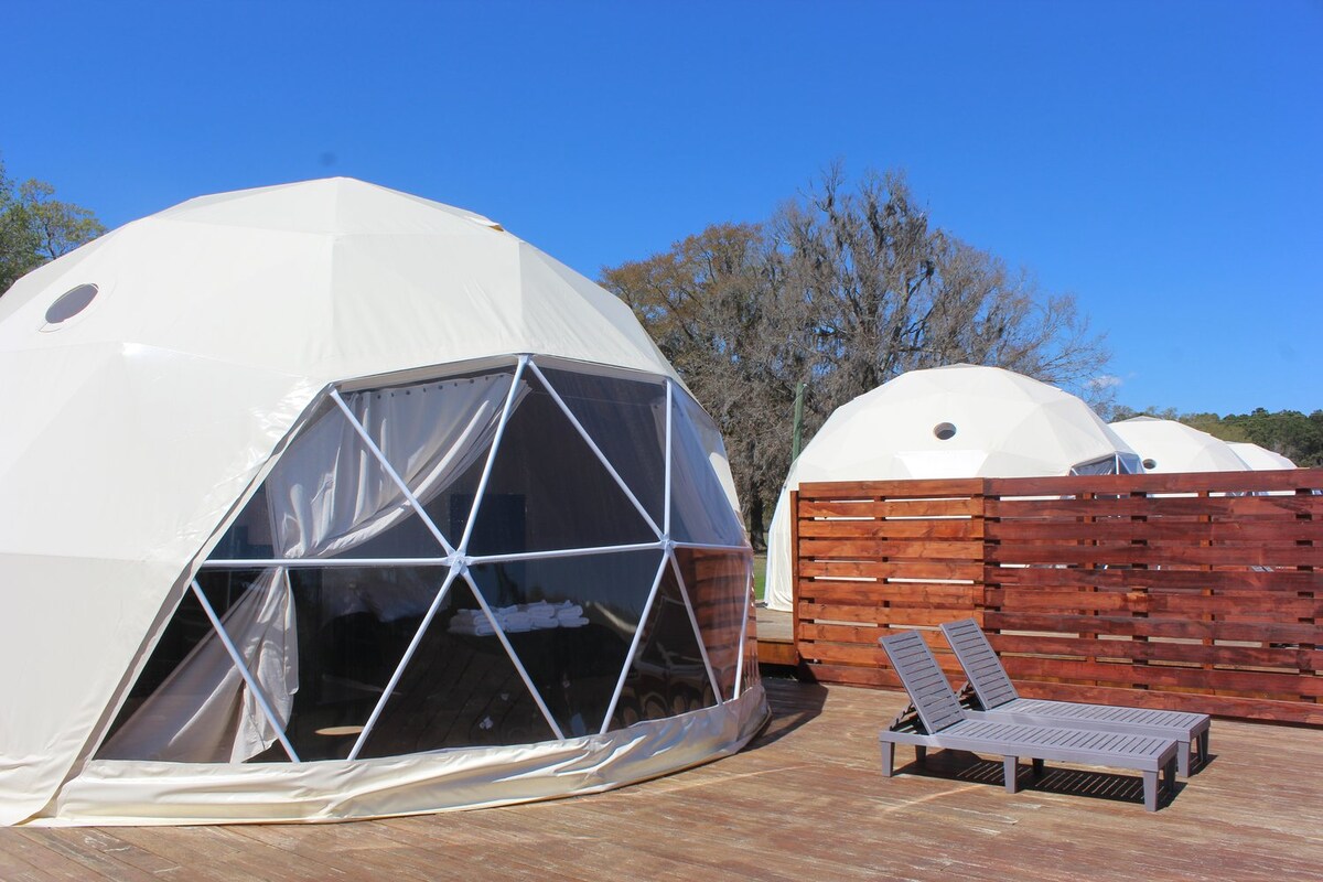 Looking for a unique vacation getaway with family and friends in Charleston, SC? The Domes at Camp Sewee are situated in the heart of Awendaw, SC with breath taking views of the intercoastal waterway and deep water access with an onsite boat landing for guests who wish to travel by or bring a boat/kayak. Each dome is fully equipped with all the essentials and comforts of luxury to make your stay unforgettable. Come experience the magic of the low country with friends and family at Camp Sewee!