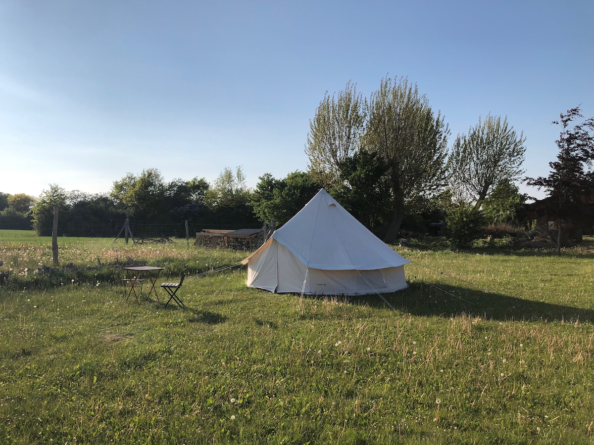 Sleep under the stars in a quiet environment. You will stay in a large Lotus Belle Stargazer tent (Ø 6m), with access to compost toilet and fresh water, campfire (firewood can be purchased). The tent is undisturbed in rural surroundings, close to both a fantastic beach, cozy harbor environment and forest. There is no traffic here and a good opportunity for a quiet retreat from everyday life. Listen to the birds, feel the grass between your toes, enjoy the peace. There are tame, curious free-range chickens. Welcome!