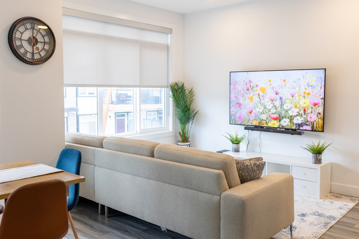 This modern 2-bedroom apartment is a great option for business or pleasure. We are a few minutes drive from the South Health Campus, Real Canadian Superstore, and the World’s biggest YMCA. We provide FREE: ✓ Coffee & Tea ✓ Wifi ✓ Parking ✓ Quality toiletries and soaps ✓ 65" QLED Smart TV: Amazon Prime, Netflix & more ✓ Water & Drinks Other services include: ✓ Self-check-in ✓ Comfortable beds & pillows ✓ Warm duvets ✓ Washer & Dryer ✓ Iron ✓ Toaster ✓ Hairdryer ✓ Microwave oven