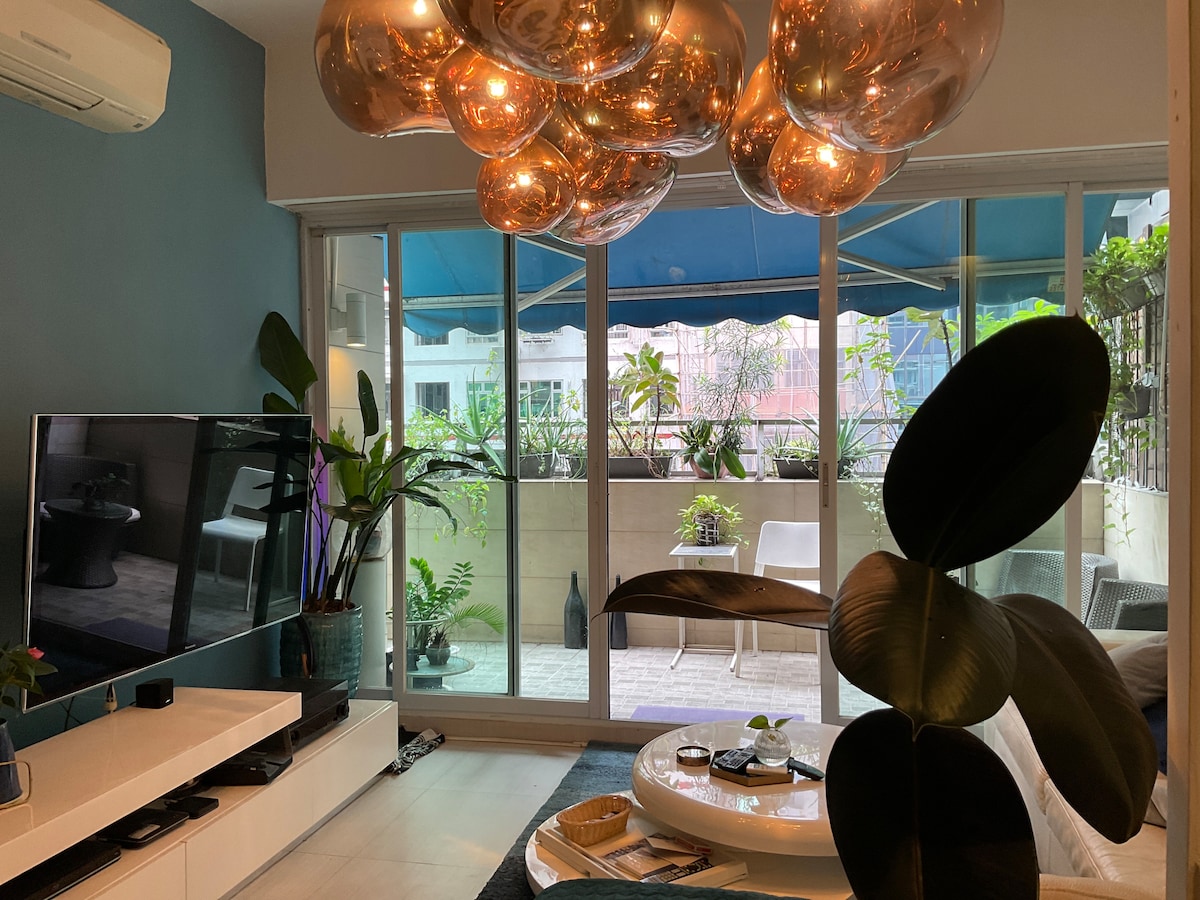 Hi, greetings from us!Our B&B wants to offer you a unique and authentic Hong Kong experience, which is very different from staying in a hotel. We cherish this home very much and work hard to keep it spotless, comfortable and clean, and the space is sufficient, and five people will not feel crowded.You will love our private terrace, where you can relax and watch the bustling Hennessy Road and feel the pulse of the city. However, to give you a more complete picture, our home is located in a very tasteful old apartment built in the 1960s.Although we take good care of the interior of the unit, the common corridors and stairwells of the building have traces of age and may be somewhat worn due to Hong Kong's humid climate.In addition, it is necessary to climb about 12 stairs from the main entrance to the elevator lobby. We've reflected these factors in the price, and we hope you'll have a great local experience here. Thank you so much for your understanding. Entire apartment, the area is 549 feet plus a 300-foot oversized terrace, the downtown center of the earthen gold can be enjoyed exclusively for 5 people, there is a 1.4m double bed in one room, the other room is a 1-meter high and low bed, the living room has a double sofa bed, the room is cozy, the room is cozy, we provide bedding and towels, and there is a coffee machine with coffee Chinese tea, with hangers, bedstands, desk, convenient transportation in Hong Kong Crossover Bay 3 minutes away, the airport bus is directly at the door of the door, the neighborhood is close to the neighborhood for food shopping, absolutely great value for money
