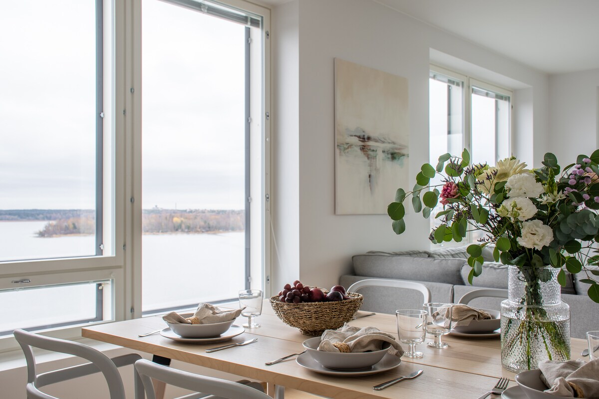 A luxury and cozy oceanfront apartment giving a relaxing release from all the chaos around. A perfect oasis to wind down and treat yourself to a beautiful bath and sauna or perhaps get some sun on the balcony on a sunny day. Located in a very central area, right next to the metro. 10 minutes is all you need to get to the heart of Helsinki with all the activities you could imagine!