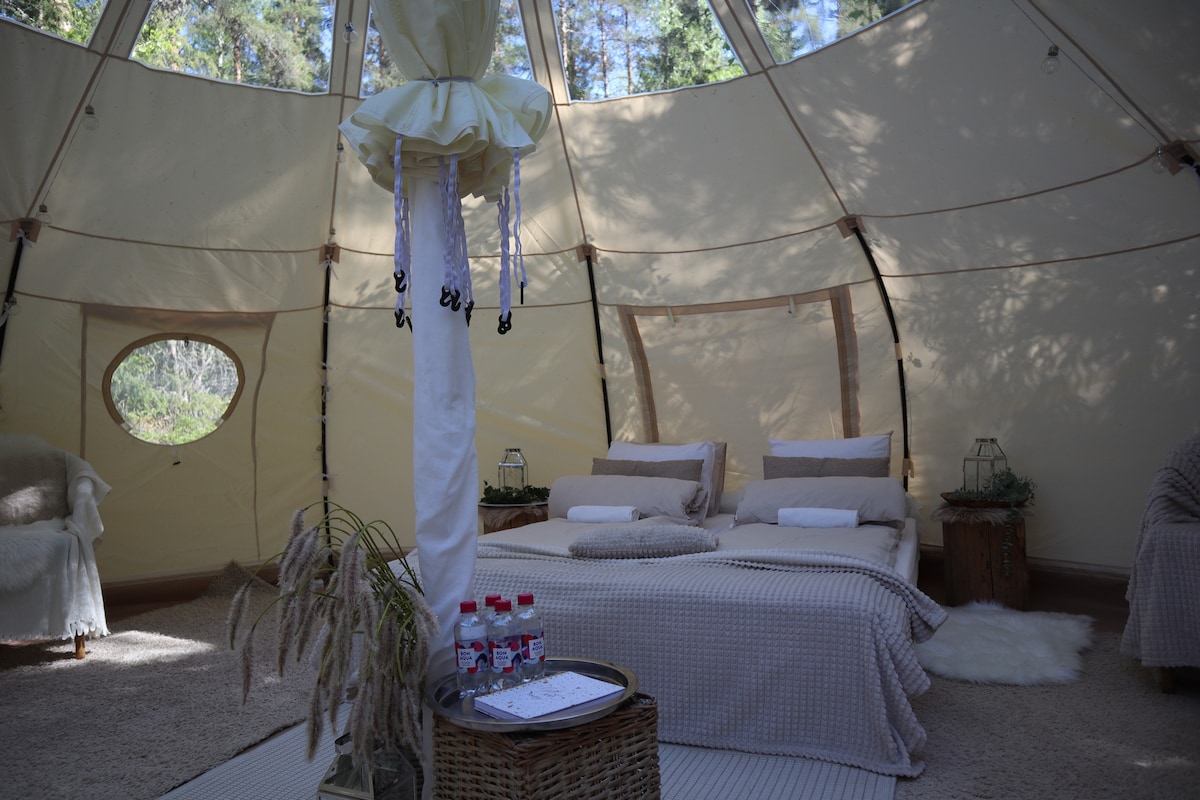 You'll sleep comfortably in a real double bed. The tent has armchairs, heating, a fan and lighting. Summer kitchen and gas grill available. The price includes a traditional wood-fired sauna, where you can wash during the sauna session. Composting outdoor toilet. You sleep comfortably in a real double bed. Armchairs, heating, fan and lighting in the tent. The summer kitchen and gas grill are in use. The price includes a traditional wood-heated sauna with washing during the sauna shift. Composting outdoor toilet.