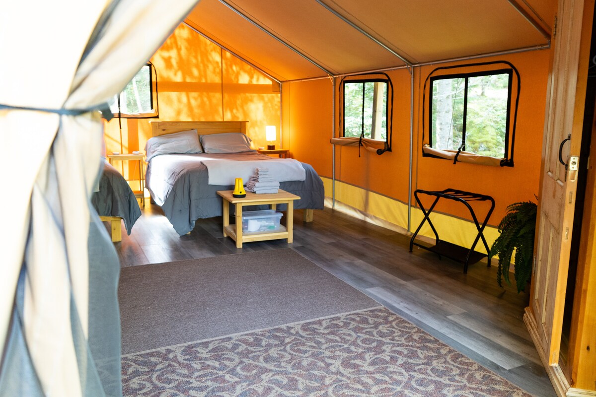 Our Safari Tent has two queen-sized bed with pillow-top mattress and quality sheets, pine furniture, fan, electric lights, and an automatic pellet wood stove. There is a large raised veranda with outdoor chairs and a private enclosure with a portable toilet and sink. Additional bathrooms and showers are nearby. Our hot tub under the stars is available for you to schedule your personal time. Please note, guests must walk a short distance uphill to reach the glamping tents.