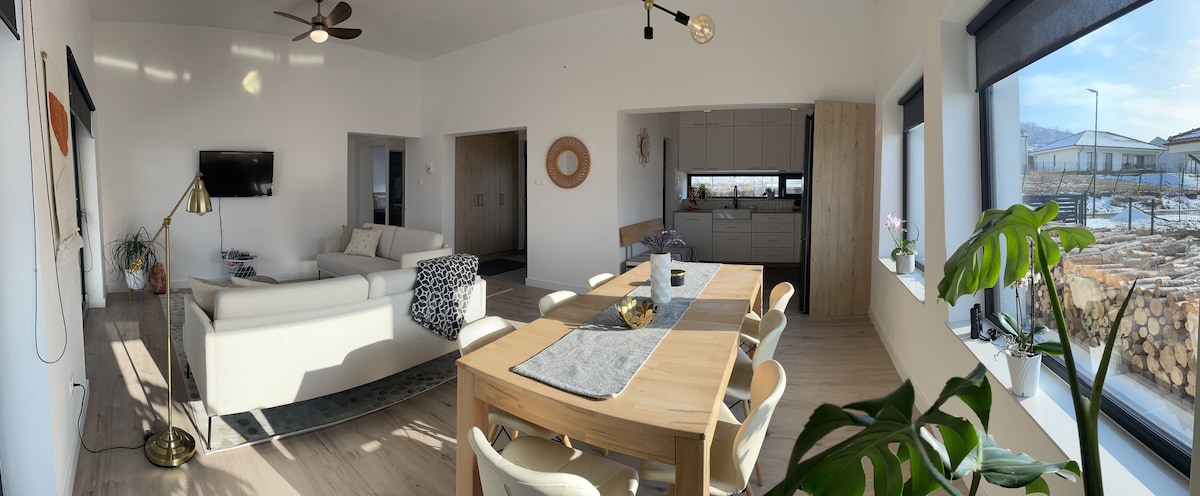 This relaxing property minutes from the city has breathtaking mountain views. Located in a new residential area overlooking Szekelyudvarhely with panoramic views all the way to Suko. Enjoy luxury and comfort with the whole family. Experience peaceful sunsets on a beautifully furnashed patio. You have the comfort of your own kitchen with everything you need, coffee and tea provided when you arrive. Wifi at no cost and crib/highchair available upon request. Outdoor fitness/park is a 3 min walk!!