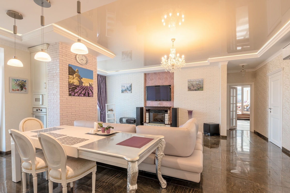 Take in far-reaching 180-degree city vistas from this 22nd-floor corner apartment. It features a concealed fireplace, along with a wealth of designer ceiling lights. This apartment is located in the Pecherskiy neighborhood. Although not teeming with tourists, Pecherskiy is still considered a part of downtown Kyiv. In fact, this neighborhood offers the best of both worlds: you are still in the middle of a buzzing city but don’t need to fight the tourist crowds.