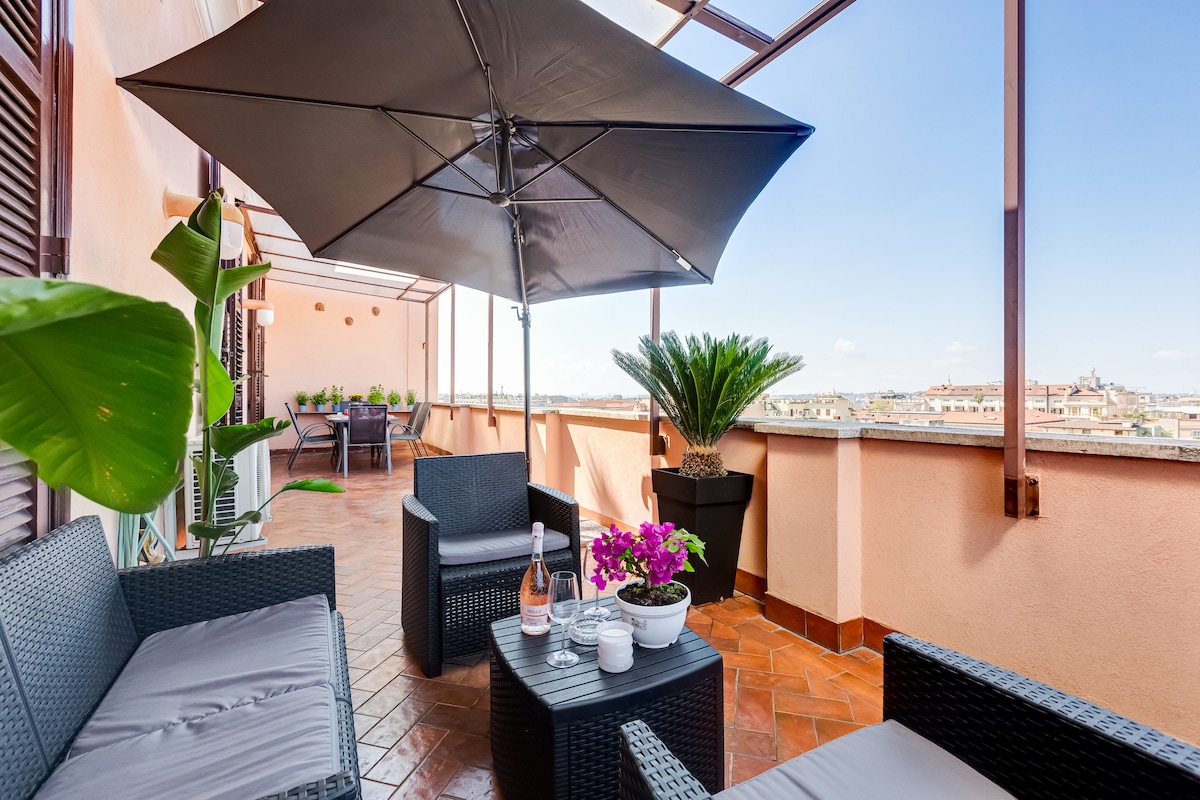 On the top floor of an old Palazzo in the heart of Ancient Rome, Atticus luxury is ideal for couples, singles, or friends. This elegant Studio exceeds all amenities you'd expect from a 5 stars hotel: welcomes you with Prosecco, Breakfast stored items, and Salvatore Ferragamo toiletries. Comfort, Elegance and Privacy for an amazing staying few minutes walk to the Coliseum & the Trajan Forum. Romance also in a glass of wine on the balcony overseeing the city centre and the Roman Forum on its side.