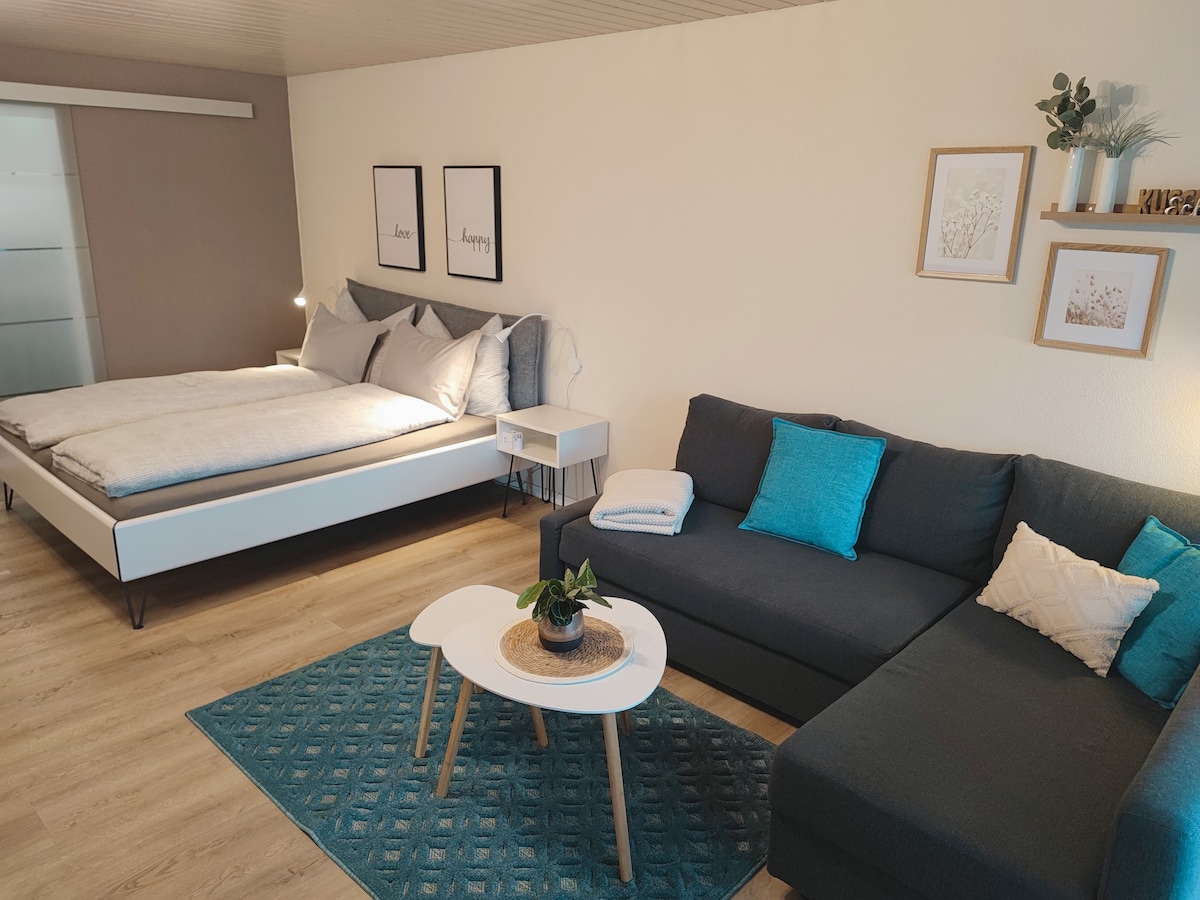 ♥-welcome to our "Kleine Auszeit" vacation apartment “stylish, cozy and central” Enjoy a “little time out” in our 2-room holiday apartment (44m2), designed with a lot of heart. The apartment was built in 2023 and is located on the first floor of our home. It consists of the following rooms: - Kitchen with dining area - Living room/bedroom (king-size bed and sofa bed) - Spacious bathroom - Small cozy outdoor terrace A free covered parking space is also available right next to the apartment.
