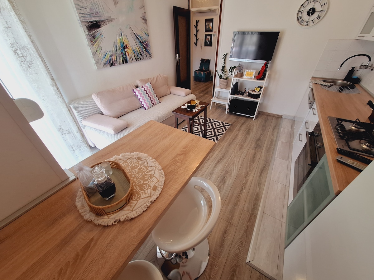 This cozy little studio apartment is located right in the very center of Split town on the main promenade. At this location you will find everything you may need just a minutes walk away. Some of notable features are large windows (with blackout curtains) that really light up the whole place, a small balcony overlooking a beautiful restaurant which can comfortably accommodate two people, a cozy bedroom with a brand-new OLED TV, a fully equipped kitchen and bathroom with a spacious shower.