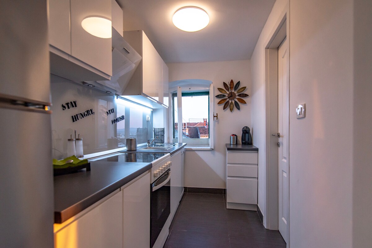 Beautiful two floor penthouse with breathtaking sea and city view from every window, located in the very heart of historical Split. Two bedrooms, living room, bathroom, and kitchen. From every window you can enjoy beautiful panoramic view of the historic old town Split, Diocletian palace, famous Riva, as well as sea view of islands Brac and Solta. 2minute walk to the famous beach Bacvice, 1minute walk to old town, 1minute walk to the ferry port, central bus, train and taxi station.
