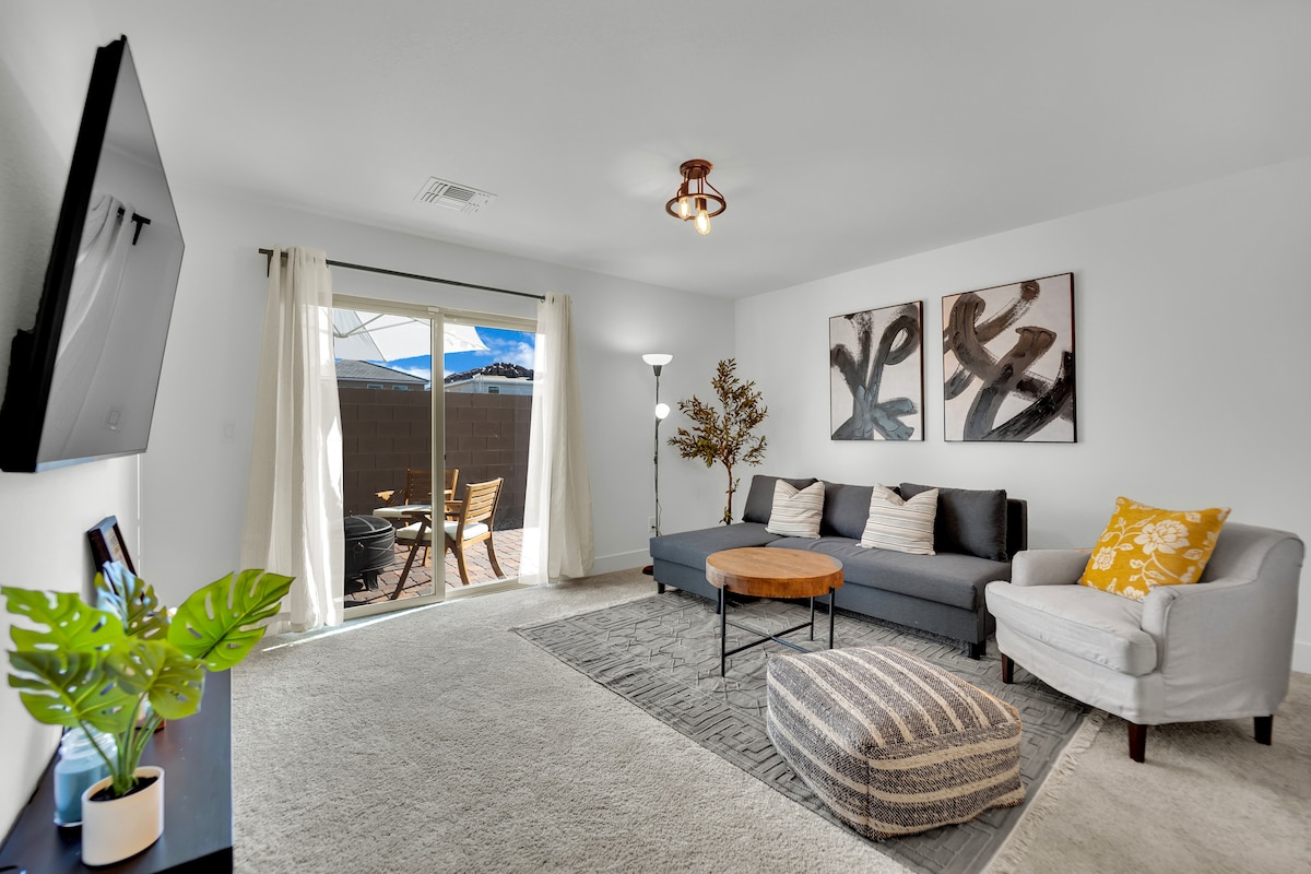 Interior completely remodeled! 10 min from Las Vegas Strip, Red Rock 15 mins, Mt Charleston 30 mins, Lake Mead 30 mins. Private patio with BBQ & fire pit. Fully equipped kitchen. WiFi and 75” TV in living room 55”TVs in bdrooms. Ceiling fans in all rooms. Free parking and community pool. Property near busy street, higher noise level. Small dogs are welcome (25 lbs or less and no more the 2 dogs). No dogs allowed on furniture. Property is not intended to host events. Please no parties allowed.