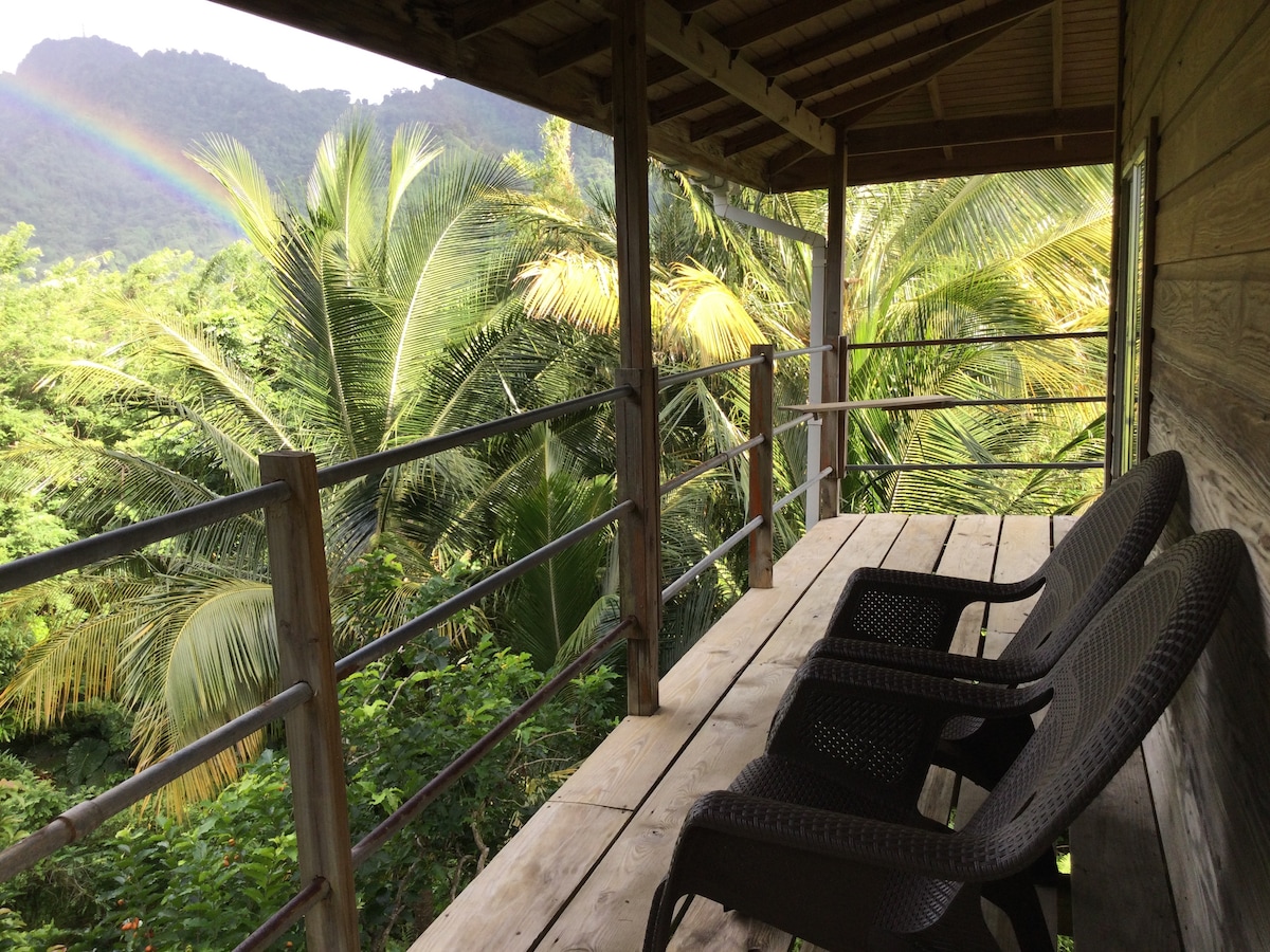 Pine house on rainforest edge Queen Bed Superior mattress Mosquito net Outstanding views valley/sea/gardens WIFI Comfortable, rustic, clean Tranquil setting Can be very windy Good for hikers, birders, yogis Daybed Hike: Vermont Trail, 'Vincy' parrot Bush Bar 10 mins. Table Rock 1 hr Drive: Superb snorkelling site 45 mins. Provided: Soap, handmade with coconut oil and no fragrance Salt, pepper Instant coffee 1 towel each Cafetiere