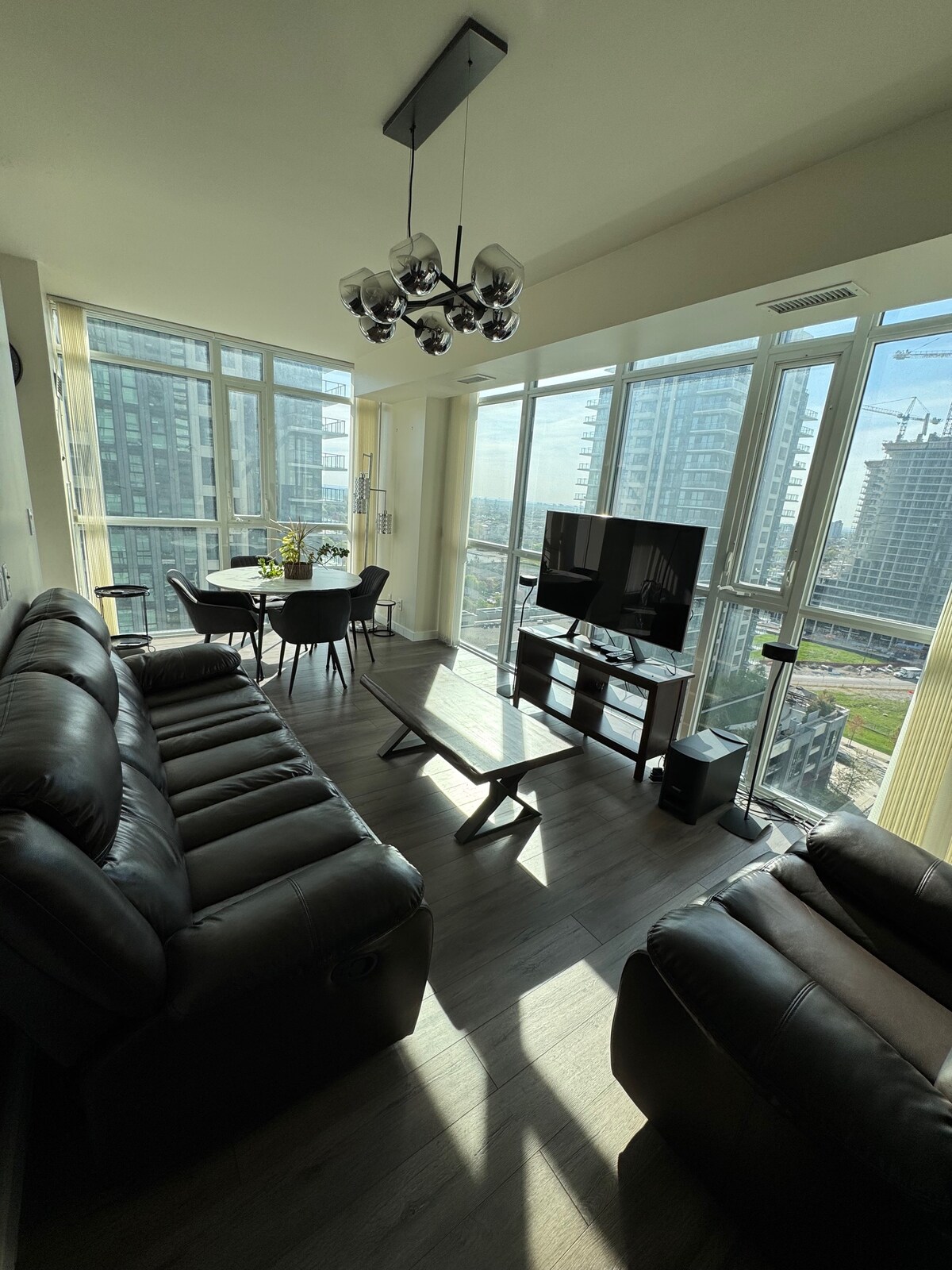 ****Brand new, less than a month old**** Experience luxury in the heart of Mississauga! Enjoy our stylish, 2BR+den condo with breathtaking city views. Steps from shopping, dining, transit. Features ENDY mattresses, Smart TVs, high-speed internet, fully-equipped kitchen, private balcony, and secure parking. Sleeps 7 comfortably. Perfect for groups, families, or business travelers. Your comfort, convenience, and style await!