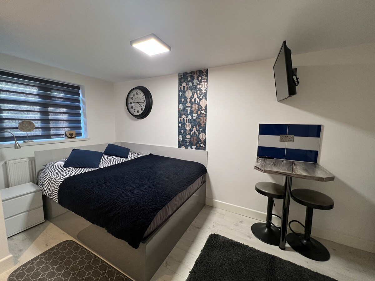 This studio flat is in the same building like our other listing. Totally separated from main house with a modern kitchenette, a comfy double bed, a bathroom with walk-in shower and underfloor heating. Ideal for an individual or for a couple to have a nice short stay. It has a smart TV, wi-fi, central heating, micro,fridge, toaster and kettle. Has not got oven, hob, freezer, washer and dishwasher. Unfortunately not suitable for babies or children to stay. There is a roundabout almost in front.