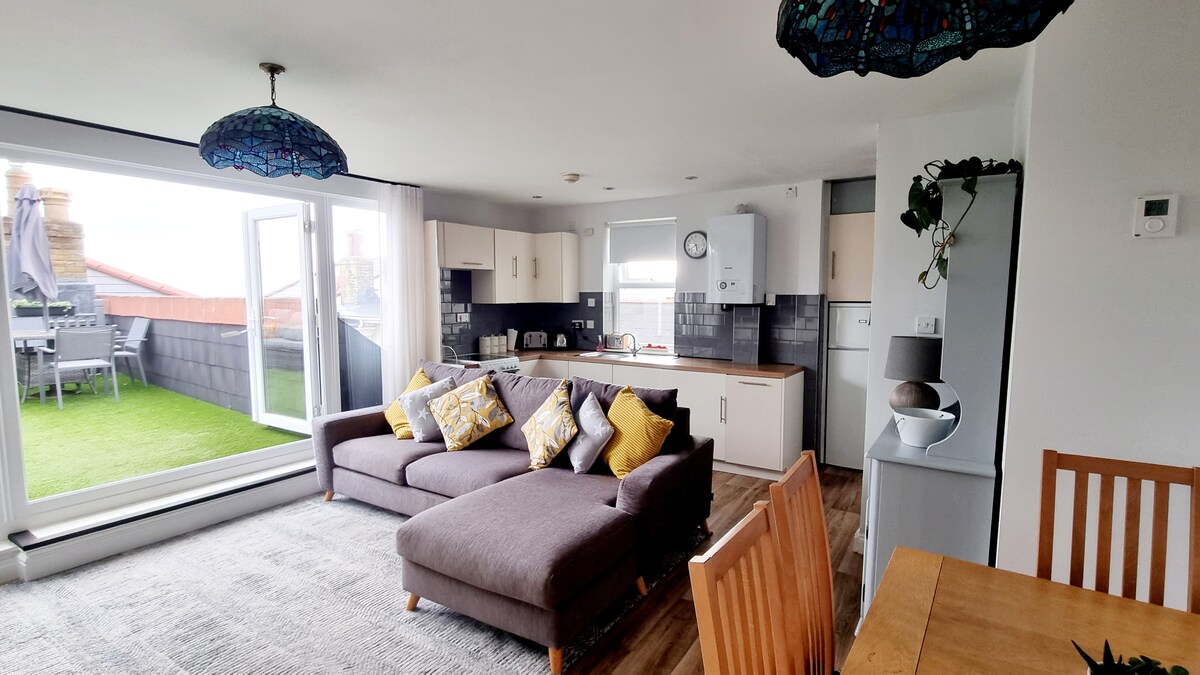 Flat 2, Millers Rock is a two bedroom ground floor flat which offers an open plan living/dining kitchen area, This room has a bay window offering a fabulous sea view. The kitchen is fully fitted and offers everything you need for your stay. Two bedrooms, one being a beautifully decorated double bedroom and the second bedroom is a cosy single with pull out trundle bed. Bathroom complete with a bath and shower over. Perfect location less than 5 minutes walk to the beach and town centre.