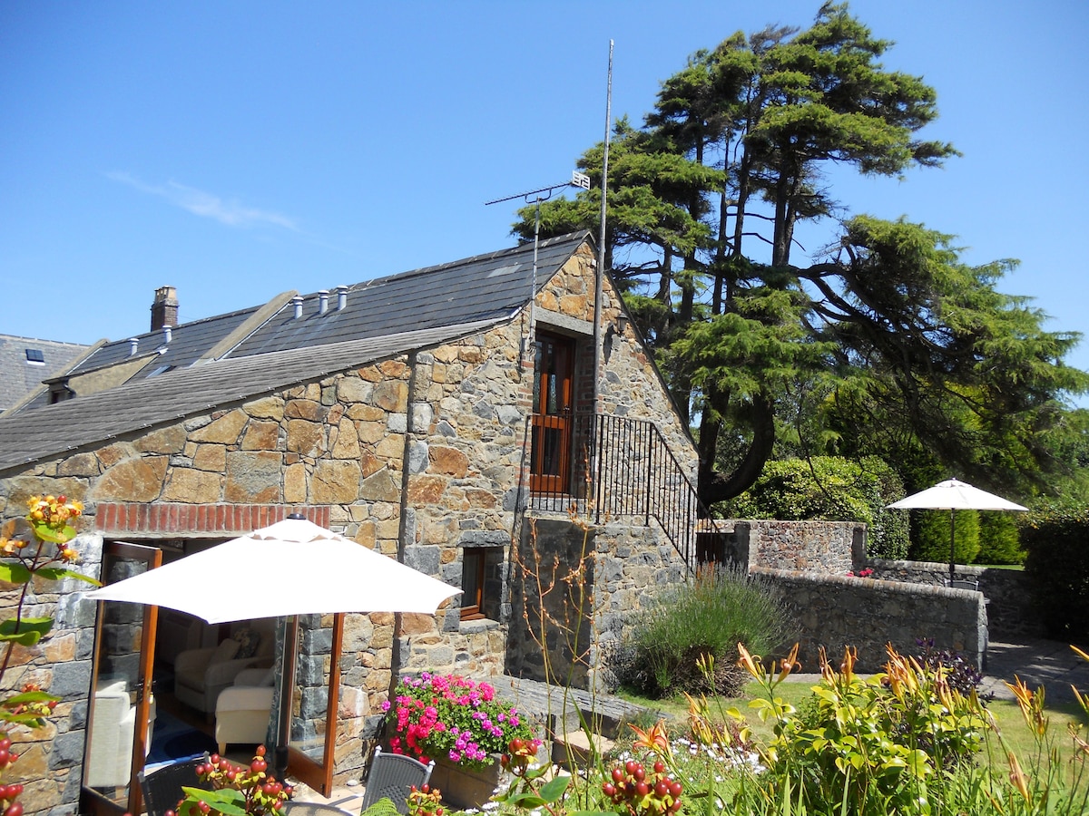 Cottage style tastefully converted 17th Century Guernsey granite farmhouse property. Private patio & shared garden with one other apartment. Welcome provisions & flowers on arrival. Close to fabulous cliff walks, secluded bays, good restaurants & supermarkets, all in walking distance. Bus stop nearby. 5 * Le Pigeonnier is on the first floor with one bedroom (king-size or twin beds), bathroom, fully equipped kitchen, spacious living/dining room. Parking immediately outside. Open all year.