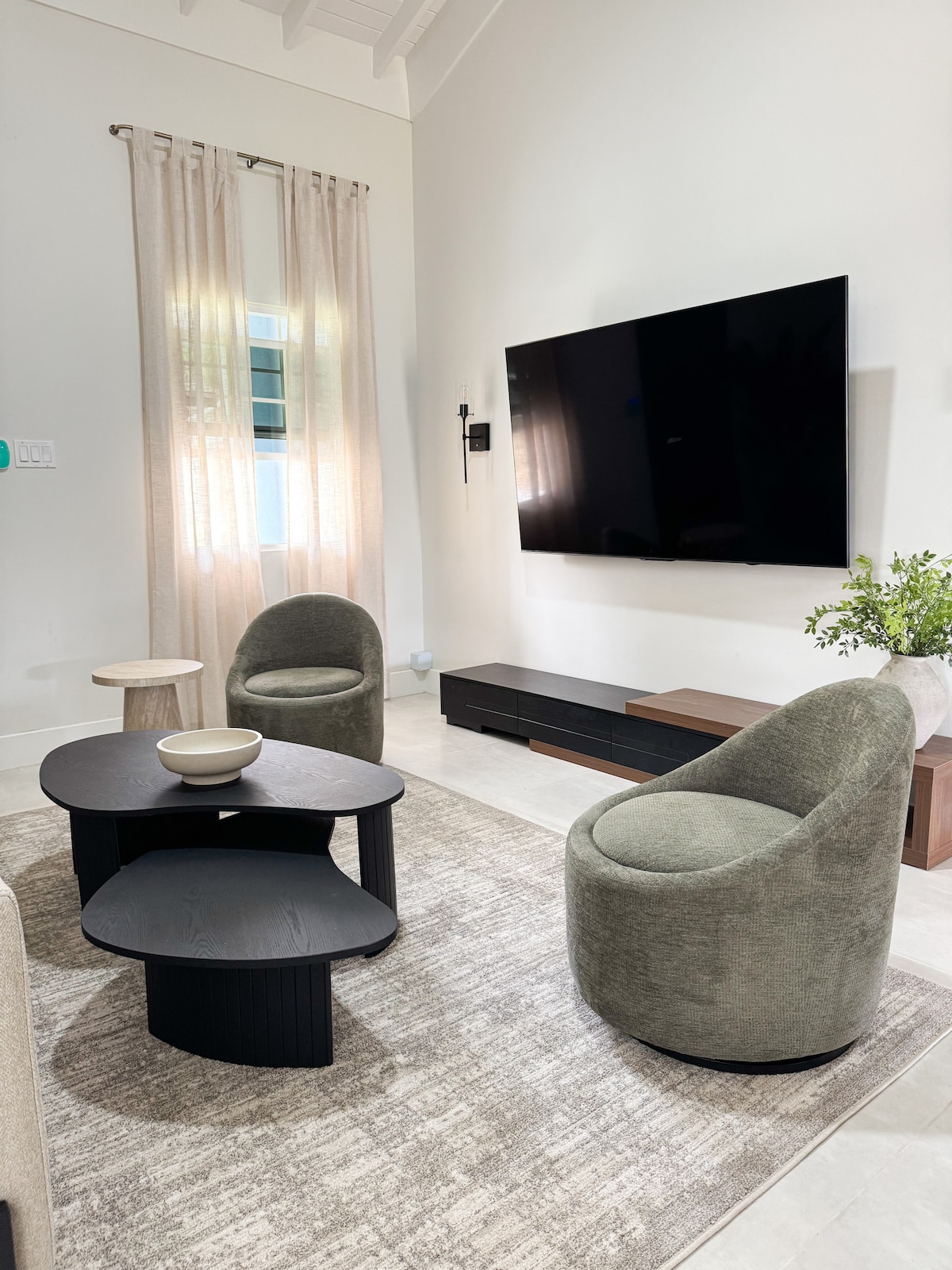 THE RUBY is a serene SMART ECO villa nestled in a gated community in the hills, 15 minutes from Ocho Rios and is ideal for families & remote workers. The villa features modern conveniences including 24/7 security, solar power + battery, A/C, ceiling fans, Wi-Fi, 2 water tanks, fenced gated back yard, security cameras, workstation with monitors, 4 smart TVs, water filtration, extended patio with a lit pergola, BBQ, basketball arcade & board games. Extras: car seat, crib, baby bath and highchair.