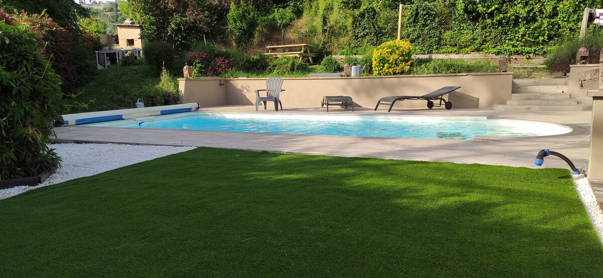 No rent for party or only swimming pool use . House (90m²) in full ground floor part independently of the first floor used by the owner. 2 rooms (25m²) with 2 independant toilets and bathrooms. Located near A72 highway (1 km), tramway (300 m) and north hosptial (1,5 km). Very quiet street and easy parking. Possibility of patio use and lunch/diner on the deck with private use of swimming pool (to discuss). Ideally : 4 people, possible : 5. English discussion with owner.