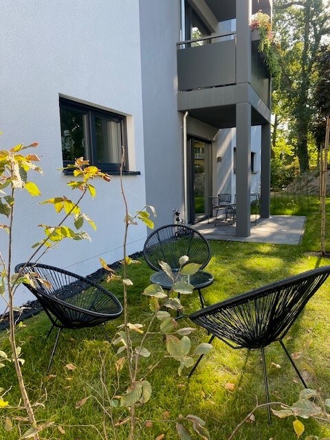 Brand-new one-bedroom apartment, tastefully furnished with private terrace. Close to amenities and public transport. Ideally located between Berlin and Potsdam. Bedroom with large double bed, comfy mattress, ample wardrobe space and access to your private secluded terrace. Living room with comfy L-shaped sofa, which converts to another double bed, TV and DVD player as well as eating space to seat four. Open-plan kitchen, well equipped with fridge/freezer, hob, oven and dishwasher.