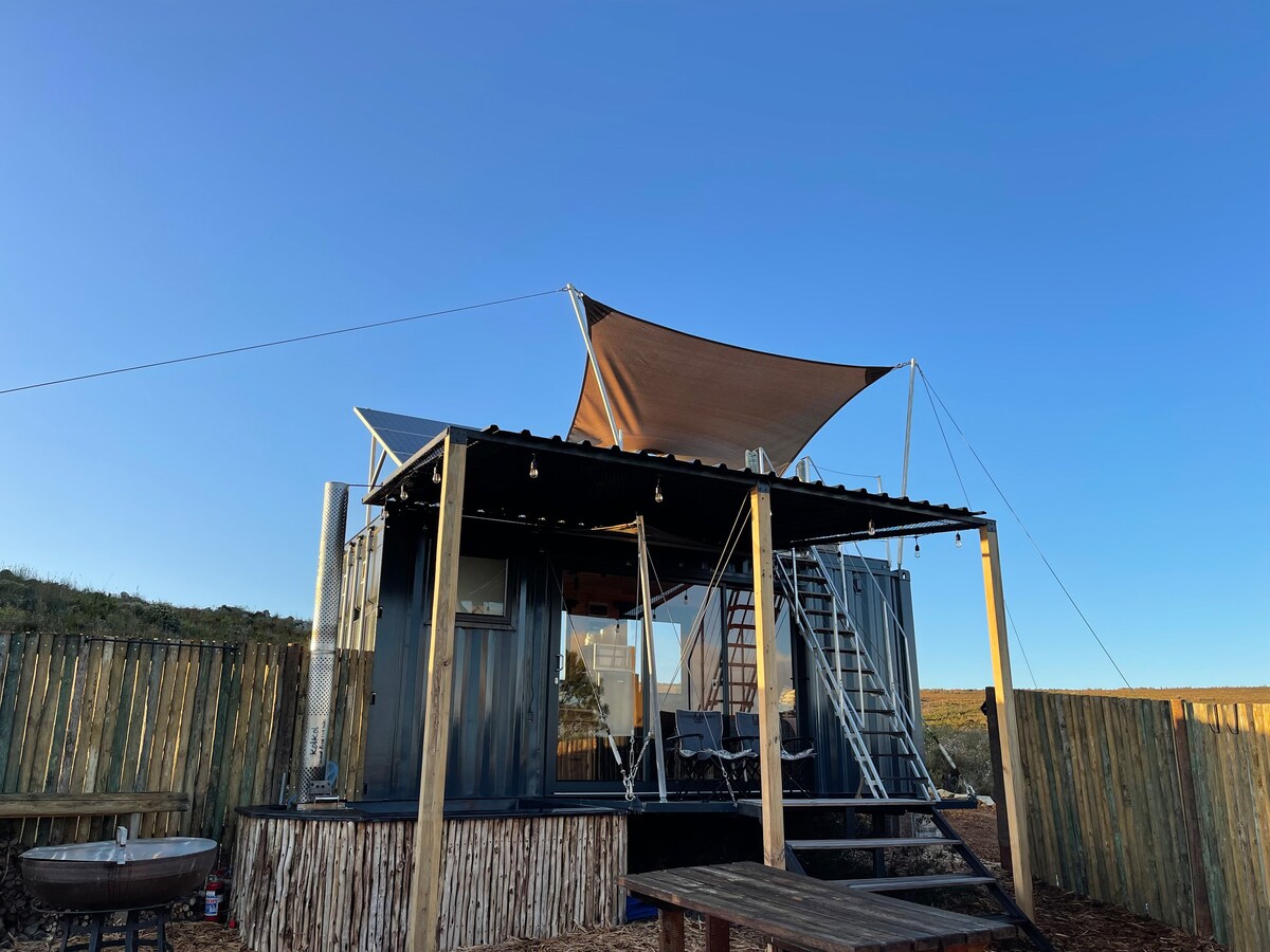 Enjoy the tranquil and peaceful environment with panoramic views over the Stranveld’s mountains and fynbos. Fijnbox is a 20ft eco container cabin situated on the mountain side overlooking Murasie and the small town, Baardskeerdersbos The cabin is perfectly suited for two adults, a great romantic gateway. This self-catering eco cabin is secluded and powered by solar and gas. It has a lovely braai lapa, with a wood fired hot tub on the patio. We provide all the luxuries you need during your stay.
