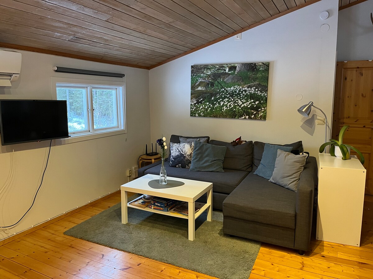 Sjöstugan - our pearl right by the lake! Private house with sleeping loft, kitchen, beautiful large room with fireplace and view of the lake. Wood-fired sauna with a dip in the lake right next door. Hot tub on the jetty - always warm. Swimming dock 5 meters outside the door. Access to a boat. If you want to buy a fishing license, contact the host. Wood for the fireplace and sauna is included. The yard is fenced all the way to the lake and our Beagle dog Vide is often loose outside. He's nice. Use of bed linens and towels, as well as cleaning, is included.