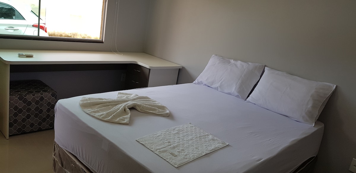 Space with double bed, extra single mattress, pillows, bed linen, bath towels, wardrobe, minibar, study bench, electric shower, Wi-Fi, smart TV, parking, electric gate, service area with washing machine, air-conditioning, balcony, puff, near the commercial center of Jatuarana Avenue (banks, bakeries, cafeterias, American store, pizzerias).