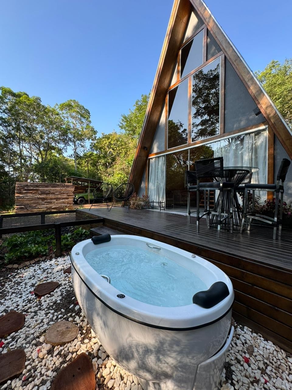 Seja bem-vindo ao nosso charmoso chalé de estilo A-frame, onde o conforto encontra a natureza. Localizado em um cenário deslumbrante cercado por palmeiras, o nosso chalé oferece a escapada perfeita para quem busca tranquilidade e contato com a natureza. Desfrute de um interior bem decorado, sala de estar confortável, cozinha totalmente equipada, e um mezanino perfeito para relaxar. Relaxe no nosso jardim, aproveite o fogo de chão sob as estrelas, ou tome um banho relaxante em nosso spa.