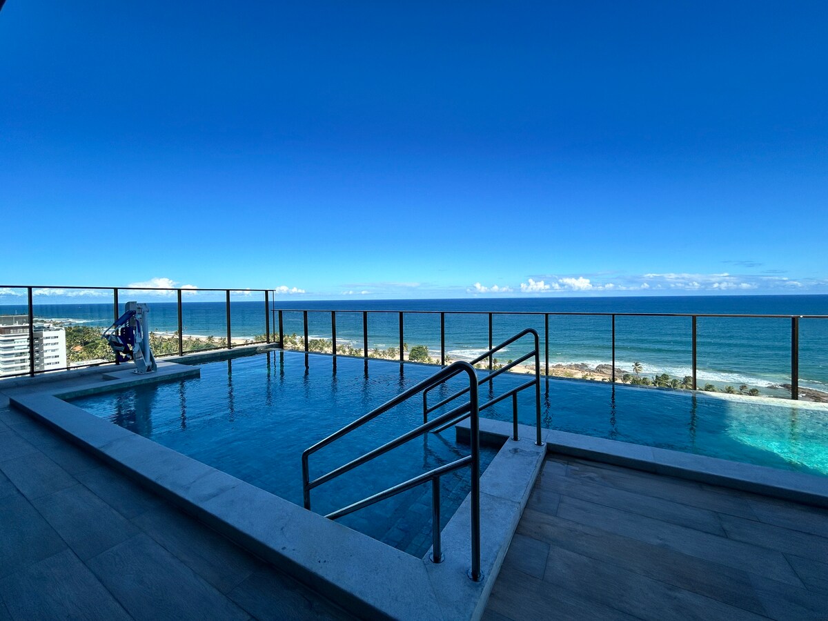 Stunning, finely decorated apartment with 2 bedrooms, one of which is a suite, split air conditioning in all individually controlled environments, front ocean view. Comfortably accommodates 6 people (2 double beds + 1 sofa bed). Enjoy the building's amenities, such as the amazing SEA VIEW rooftop pool, a fully air-conditioned gym with a spinning room, 2 coworking rooms and a playroom. Let yourself be enveloped by the magic of Bahia and start creating unforgettable memories!
