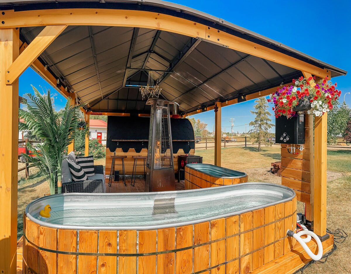 Step into a cozy boho-inspired cabin retreat with vibrant charm and earthy textures. Perfect for 2 guests, with a queen bed, AC, fireplace, fridge, TV, linens and towels. Private bathroom/shower access via scan card. Enjoy access to our unique wellness area: soak in a hillbilly-style wood-burning hot tub (shared with one cabin), relax in the shared wood-burning sauna, or refresh in the cold plunge. On-site coin laundry available at Prairie Junction RV Resort in Stettler, AB.