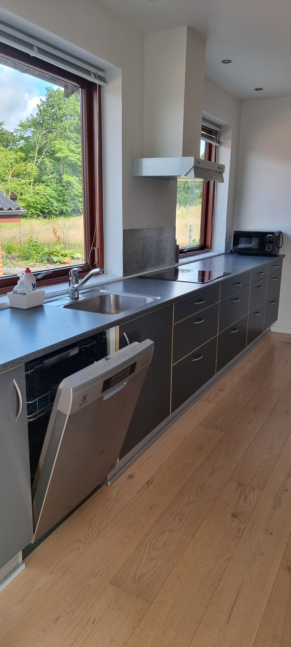 The home consists of a living room, bedroom, kitchen and bathroom on the ground floor of the manager's residence for Hårby Dairy. Private entrance and free parking. The house was built in 1905, there are wooden floors and high ceilings in all rooms. Bedroom with double bed and space for a cot - Living room with dining table and 4 chairs, sofa bed with 2 beds, TV, Wi-Fi, books and games - Kitchen with dishwasher, refrigerator, stove, - Bathroom with toilet, shower, washing machine. Outdoor fenced space with dining area and barbecue.