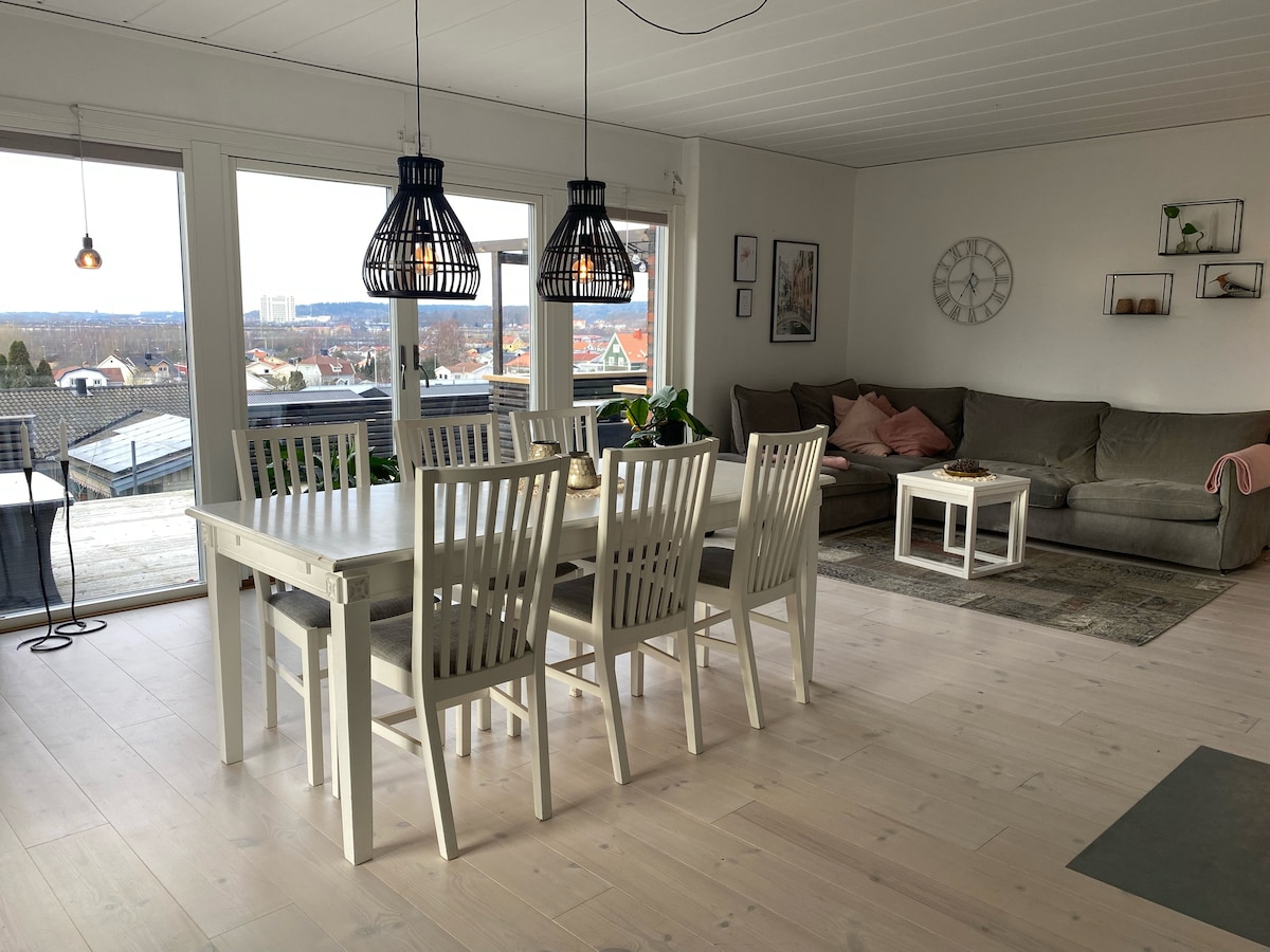 En modern, ljus lägenhet belägen på vinden i en villa med slående utsikt över staden och Liseberg. Lägenheten ligger I ett mysigt och lugnt villaområde med gångavstånd till stan. Kök, matbord, dubbelsäng och en bäddsoffa gör det möjligt att ta med dina vänner.