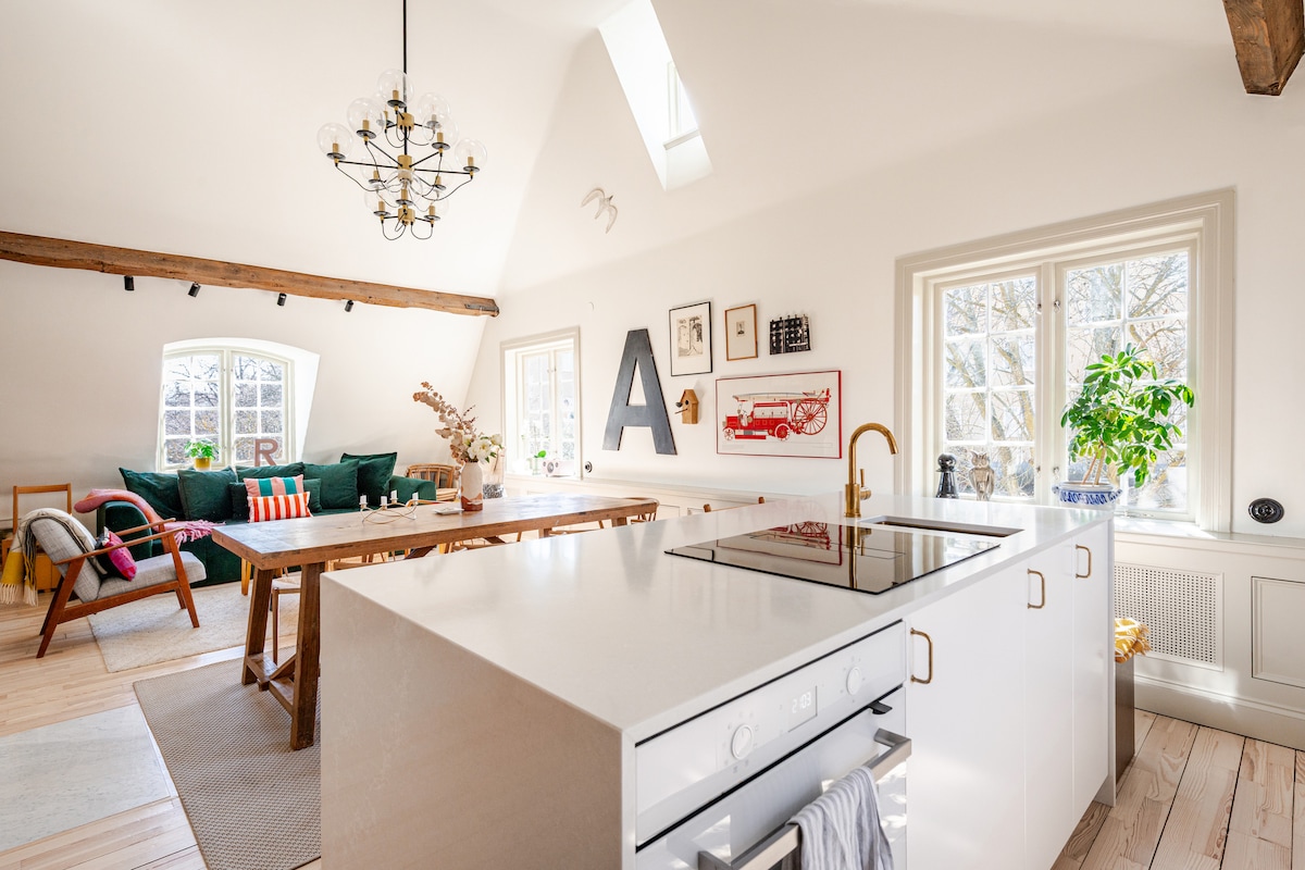 Unique opportunity to live in one of Stockholm's few mansions; Charlottendal from 1779. The apartment is on the upper floor in the main house and is 128 sqm. The apartment has its own entrance. Ceiling height in kitchen, livingroom is astonishing 4 meters. Beautiful garden with three more houses from the 1800- century. The apartment is situated 5 min walk to the subway (Liljeholmen), anda 15 minutes' walk to Södermalm. .