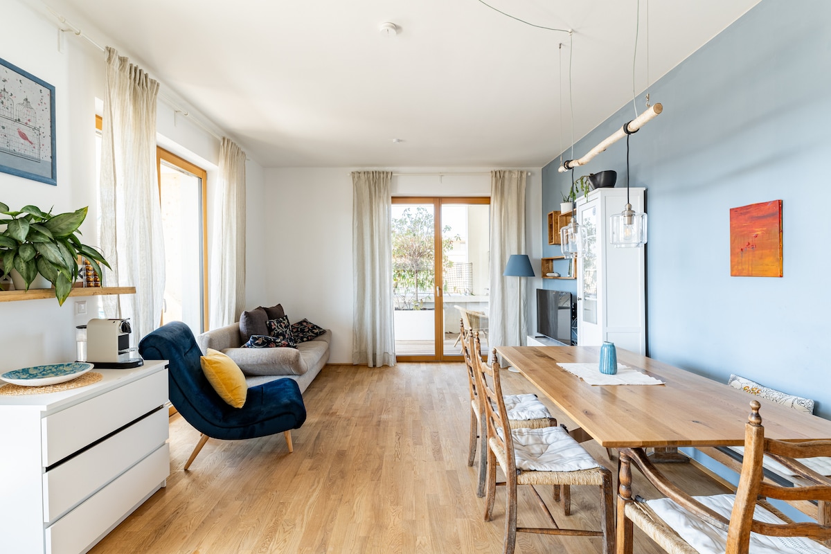 This 74 m² light-flooded apartment with free underground parking is centrally located in the hip district of Lend in an architecturally award-winning house and can accommodate up to 6 people. An absolute highlight is the 60 m² terrace, which invites you to enjoy the evening sun with cozy seating and dining areas. In addition, you can relax in the large bathtub with whirlpool function.