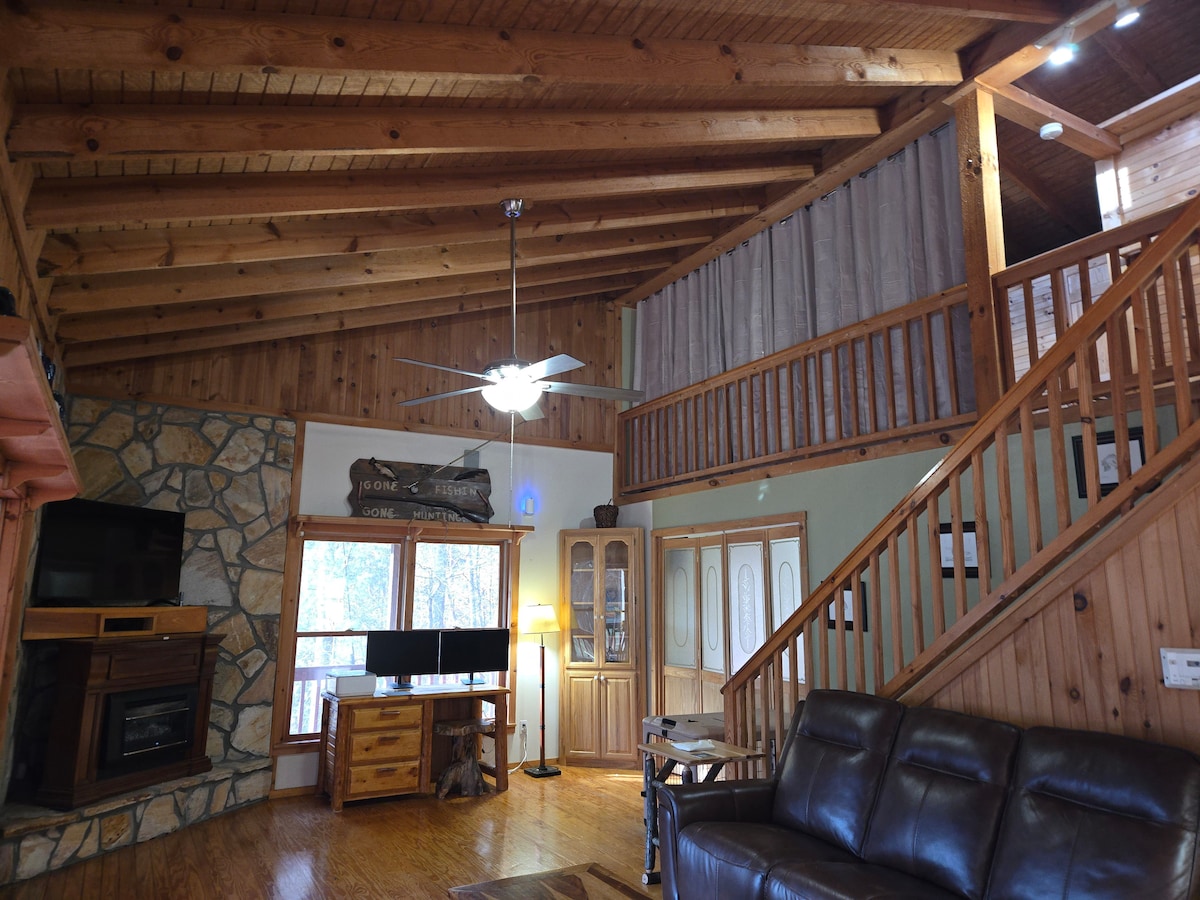 You deserve an escape to a top rated retreat! Killer View Cabin w/EV charger has stunning year-round views; is close to town, lakes and attractions! Unwind in the hot tub, gather around the outdoor fire pit, or play the many high and low tech games offered. Stay connected with high speed internet & dedicated work space. Like sports?…there’s cable! Getting there- the almost entirely paved road available, leading to the flat parking pad, makes for a stress free arrival to our charming cabin.