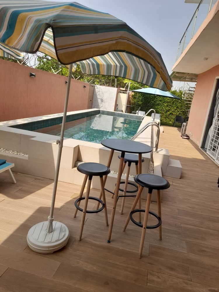 Relax in this large, modern, and elegant air-conditioned studio. It has a private outdoor courtyard equipped with a spa and garden furniture to enjoy the outdoors. It is located a 5-minute walk from many amenities (bakeries, supermarkets, restaurants, music area, pharmacy, taxis, bus) and the artisans' village. A 10-minute drive/taxi from Bassam beaches with its seaside restaurants. 30 minutes from the airport and 40 minutes from Abidjan (accessible by bus)