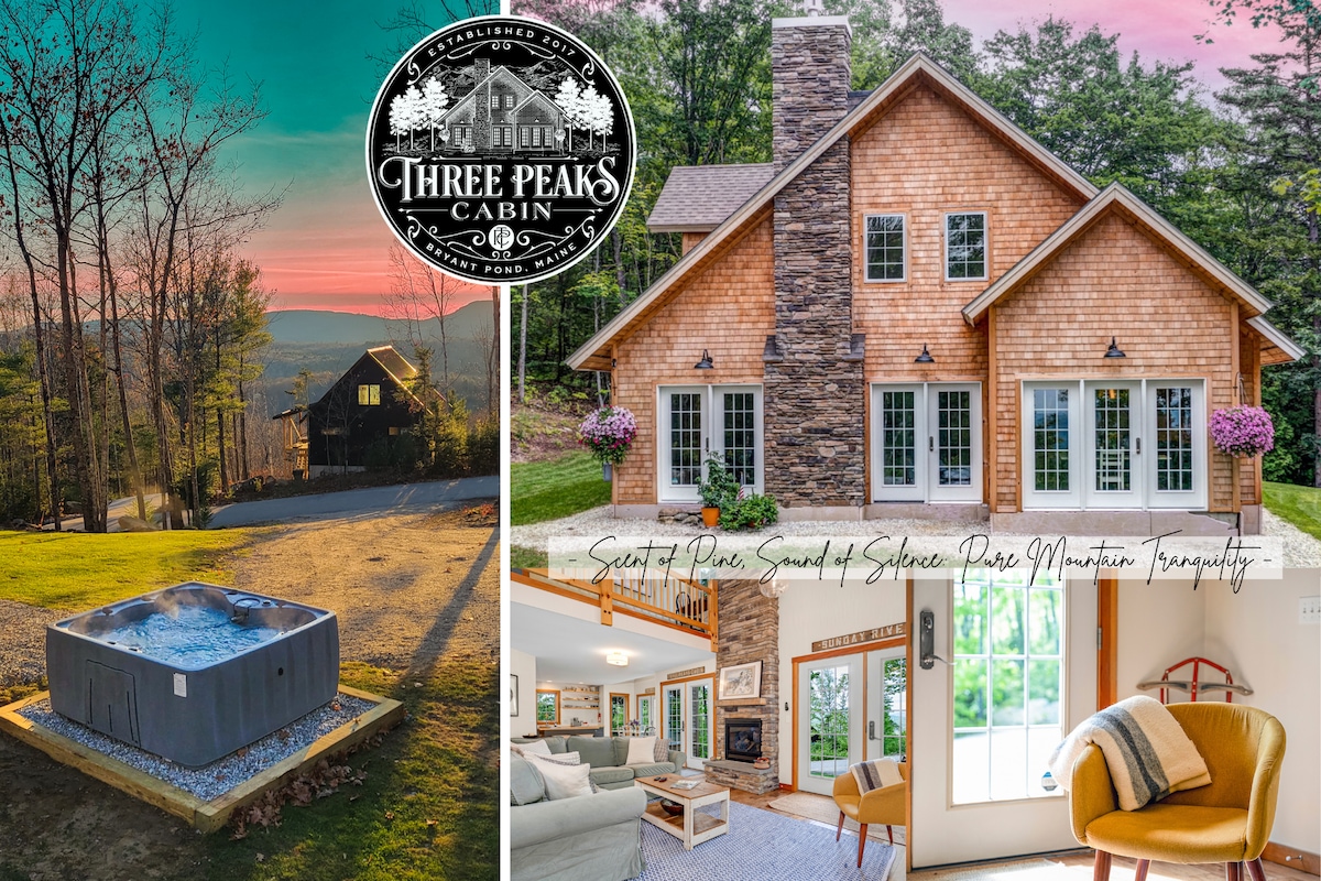 Three Peaks Cabin is a one of a kind Beautiful Mountain Home located in tranquil Bryant Pond Maine. Home sits atop peak that has direct views of the White Mountains, Lake Christopher and more as well as a stone throw away from world class skiing at Sunday River & Mt Abram. You'll feel right at home when you walk through the doors of this Bryant Pond vacation rental. The 3-bedroom, 2 -bath chalet-style house features 1625 square feet of beautiful living space complete with tasteful decor, with three large Pella French doors pointing directly west with views of Mt. Abram and Mt. Washington. Overlooking the Lake Christopher and surrounded by trees at the end of a cul-de-sac, this home offers families and groups plenty of outdoor recreation opportunities from boating and watersports to hiking, biking, and skiing! 65" Flat-Screen TV equipped with Dish Network Satellite, w/ Netflix, Prime Video, Dish Multisport w/ NFL Red zone | Gourmet Kitchen | Floor-to-Ceiling Windows From outdoor sports to downtown Bethel's unique shops and restaurants, this upscale retreat is the perfect getaway spot for families and groups! Bedroom 1: Queen Bed | Bedroom 2 Two Twin Beds | Bedroom 3: Two Twin Beds. OUTDOOR LIVING: Full private yard, with beautiful manicured grass and flowers during summer and fall months. Brand new Weber Gas grill, well designed fire pit with new Adirondack chairs & lovely outdoor sitting area with tables and chairs to sit and enjoy the view of the white mountains. INDOOR LIVING: 2 flat-screen TVs w/ streaming capabilities, Floor to ceiling fireplace which accompanies a large sectional couch to cozy up on the cool Maine nights next to the fireplace. dining table which sit four. The beautiful Gourmet Kitchen comes with stainless steel commercial gas range, Large stainless steel Refrigerator stocked with fresh neighboring Poland Spring waters, Stainless steel Dishwasher as well as an island where two additional seats are available. The downstairs bathroom also comes with a jacuzzi bath tub ready to relax the night away after a long day of enjoying western Maine festivities. KITCHEN: Fully equipped, drip coffee maker, keurig coffee & latte maker, toaster, cooking utensils, cutlery, spices, stainless steel appliances, dishware & flatware, breakfast bar GENERAL: Free Wi-Fi, central heat, central a/c, ceiling fans, towels/linens, complimentary toiletries such as Shampoo, Conditioner, Body Wash, Lotion, Goat Milk Soaps etc. & washer/dryer FAQ: Pet fee (paid pre-trip), stairs required for access PARKING: Driveway (4 vehicles) Three Peaks Cabin is located at 110 Yawkey Way, Bryant Pond, Maine. The home is located on a private street maintained by our HOA association. There are 6 total houses which included "Three Peaks Cabin". The property is located all the way up a steep paved road, last house on the right at the end of the culdesac.