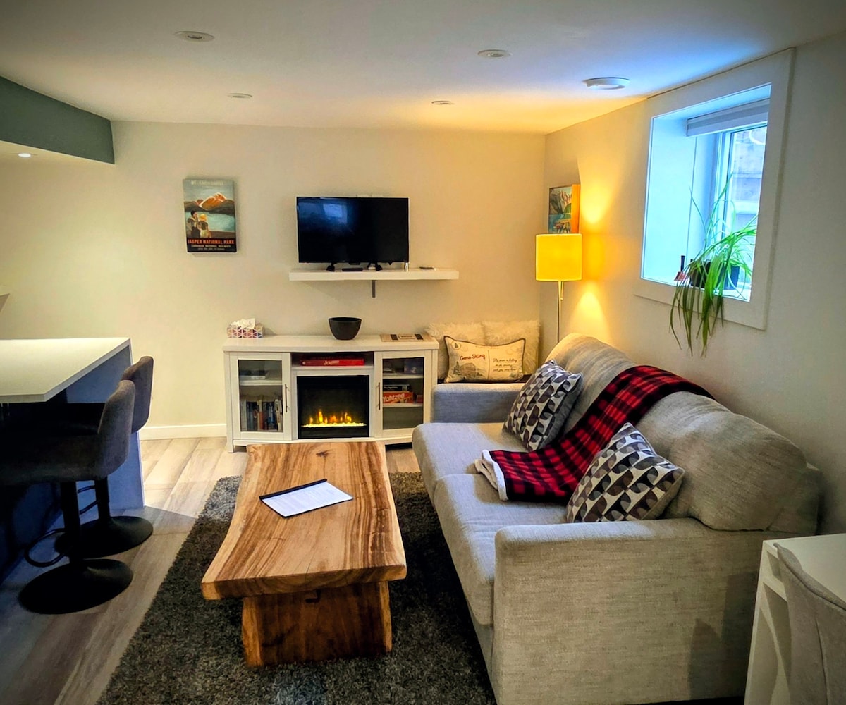This colourful and cosy suite has free parking and a private entrance. It is bright and comfortable with two queen size beds, black-out blinds, living room with fireplace and big TV, full bathroom, full kitchen, washer and dryer, heating and A/C. Bathrobes, slippers, toiletries and basic cooking supplies are provided, plus Netflix and Disney+. Please let me know if you are bringing a dog as there is a $30 fee. LGBTQI2SA+ friendly.