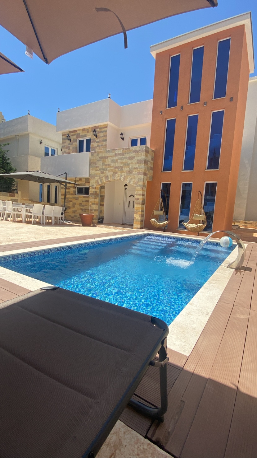 Relax with the whole family at this peaceful place to stay. Elegant Villa where luxurious comfort dominates designed in contemporary minimalist style with Mediterranean spirit influenced in every detail. Villa features with 3 bedrooms, 4 bathrooms, 3 living rooms, 3 full size kitchens ,3 dining room, 6 balconies , outdoor swimming pool and stunning garden with olive trees and many other species of tropical and subtropical plants. There is also private parking place for our guests.