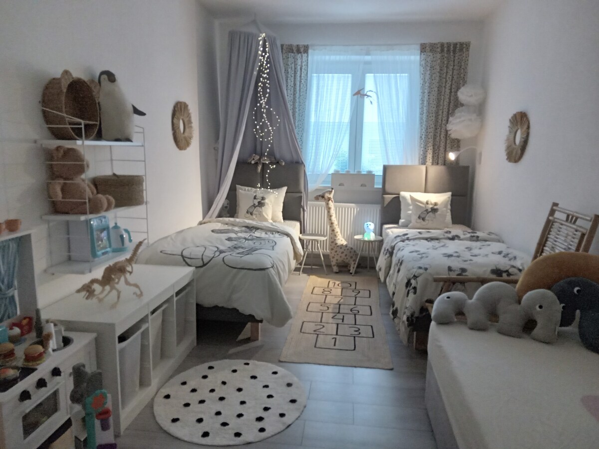 The apartment is exceptional due to its ideal location in the center of Olomouc, in a quiet and prestigious street. It has 2 bedrooms, a living room and a fully equipped kitchen (free tea, coffee, sweets, ...). The bathroom has a bathtub (free hair cosmetics, shower gel, hairdryer, ...) The balcony has a seating area. Toys for children. Free parking in front of the house. The perfect place to relax and discover the history of the city. Free wine or sparkling wine with a stay of two nights 🍷