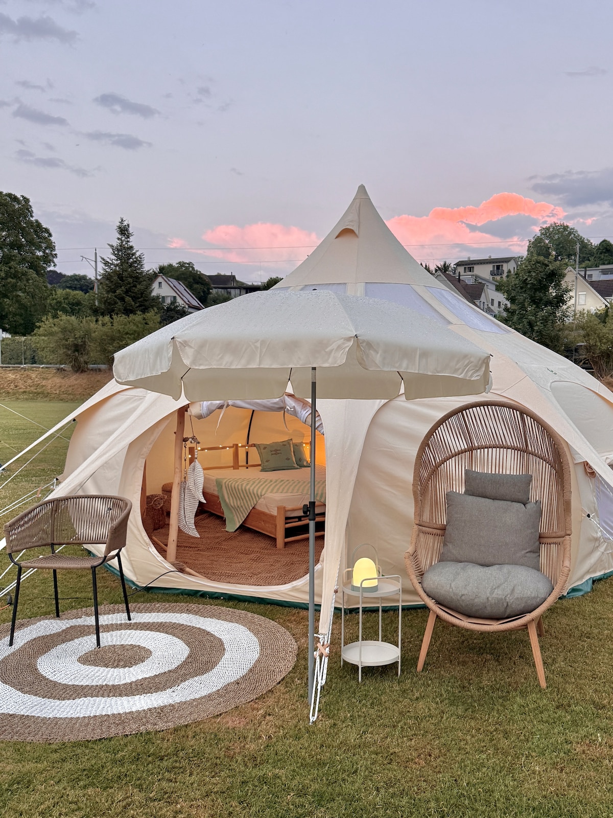 Glamping Lakefront – the highlight directly on Lake Constance Our stylishly furnished glamping tent with translucent roof and panoramic side windows is situated just a few meters away from the water. Inside, there's a cozy interior with a comfortable double bed, an additional daybed, seating, atmospheric lighting, a coffee machine and a small fridge. The sanitary facilities are about 100 m away. There are showers, toilets and a washing area.